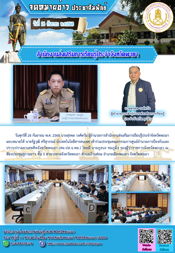 วันศุกร์ที่ 26 กันยายน พ.ศ. 2568 นายสุรพล วงศ์หวัน ผู้อำนวยการสำนักงานส่งเสริมการเรียนรู้ประจำจังหวัดพะเยา มอบหมายให้ นายรัฐวุฒิ ศรีสุวรรณ์ นักเทคโนโลยีสารสนเทศ เข้าร่วมประชุมคณะกรรมการศูนย์อำนวยการป้องกันและปราบปรามยาเสพติดจังหวัดพะเยา (ศอ.ปส.จ.พย.) โดยมี นายภูธนะ ชมภูมิ่ง รองผู้ว่าราชการจังหวัดพะเยา ณ ห้องประชุมภูกามยาว ชั้น 5 ศาลากลางจังหวัดพะเยา ตำบลบ้านต๋อม อำเภอเมืองพะเยา จังหวัดพะเยา