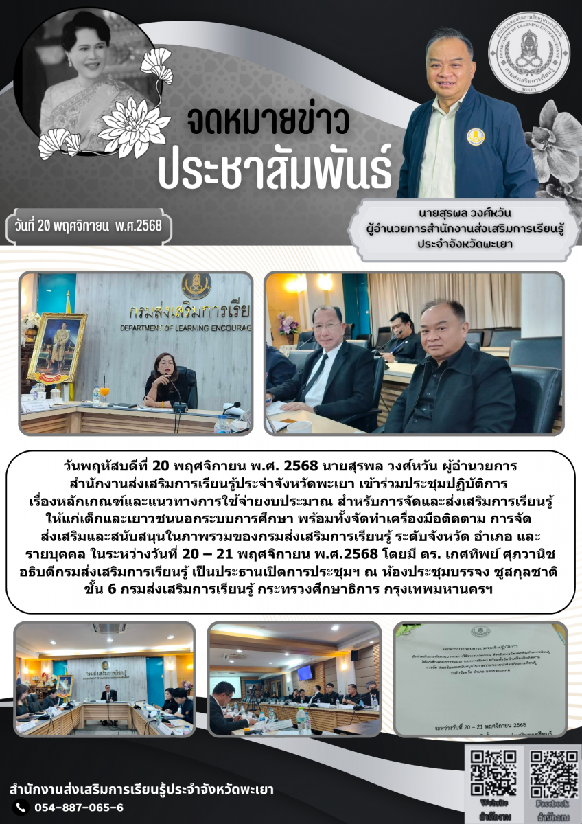 วันพฤหัสบดีที่ 20 พฤศจิกายน พ.ศ. 2568 นายสุรพล วงศ์หวัน ผู้อำนวยการสำนักงานส่งเสริมการเรียนรู้ประจำจังหวัดพะเยา เข้าร่วมประชุมปฏิบัติการ เรื่องหลักเกณฑ์และแนวทางการใช้จ่ายงบประมาณ สำหรับการจัดและส่งเสริมการเรียนรู้ให้แก่เด็กและเยาวชนนอกระบบการศึกษา พร้อมทั้งจัดทำเครื่องมือติดตาม การจัด ส่งเสริมและสนับสนุนในภาพรวมของกรมส่งเสริมการเรียนรู้ ระดับจังหวัด อำเภอ และรายบุคคล ในระหว่างวันที่ 20 – 21 พฤศจิกายน พ.ศ.2568 โดยมี ดร. เกศทิพย์ ศุภวานิช อธิบดีกรมส่งเสริมการเรียนรู้ เป็นประธานเปิดการประชุมฯ ณ ห้องประชุมบรรจง ชูสกุลชาติ ชั้น 6 กรมส่งเสริมการเรียนรู้ กระทรวงศึกษาธิการ กรุงเทพมหานครฯ