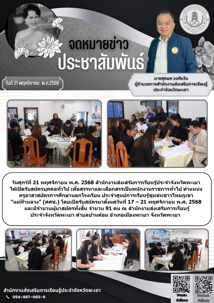 วันศุกร์ที่ 21 พฤศจิกายน พ.ศ. 2568 สำนักงานส่งเสร้มการเรียนรู้ประจำจังหวัดพะเยา ได้เปิดรับสมัครบุคคลทั่วไป เพื่อสรรหาและเลือกสรรเป็นพนักงานราชการทั่วไป ตำแหน่ง ครูอาสาสมัครการศึกษานอกโรงเรียน ประจำศูนย์การเรียนรู้ชุมชนชาวไทยภูเขา “แม่ฟ้าหลวง” (ศศช.) โดยเปิดรับสมัครมาตั้งแต่วันที่ 17 – 21 พฤศจิกายน พ.ศ. 2568 และมีจำนวนผู้มาสมัครทั้งสิ้น จำนวน 91 คน ณ สำนักงานส่งเสริมการเรียนรู้ประจำจังหวัดพะเยา ตำบลบ้านต๋อม อำเภอเมืองพะเยา จังหวัดพะเยา