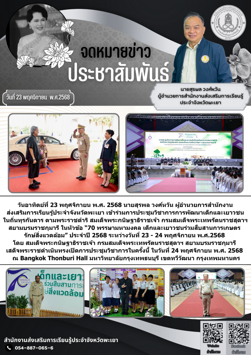 วันอาทิตย์ที่ 23 พฤศจิกายน พ.ศ. 2568 นายสุรพล วงศ์หวัน ผู้อำนวยการสำนักงานส่งเสริมการเรียนรู้ประจำจังหวัดพะเยา เข้าร่วมการประชุมวิชาการการพัฒนาเด็กและเยาวชนในถิ่นทุรกันดาร ตามพระราชดำริ สมเด็จพระกนิษฐาธิราชเจ้า กรมสมเด็จพระเทพรัตนราชสุดาฯ สยามบรมราชกุมารี ในหัวข้อ “70 พรรษามหามงคล เด็กและเยาวชนร่วมสืบสานการเกษตร รักษ์สิ่งแวดล้อม” ประจำปี 2568 ระหว่างวันที่ 23 - 24 พฤศจิกายน พ.ศ.2568 โดย สมเด็จพระกนิษฐาธิราชเจ้า กรมสมเด็จพระเทพรัตนราชสุดาฯ สยามบรมราชกุมารี เสด็จพระราชดำเนินทรงเปิดการประชุมวิชาการในครั้งนี้ ในวันที่ 24 พฤศจิกายน พ.ศ. 2568 ณ Bangkok Thonburi Hall มหาวิทยาลัยกรุงเทพธนบุรี เขตทวีวัฒนา กรุงเทพมหานคร