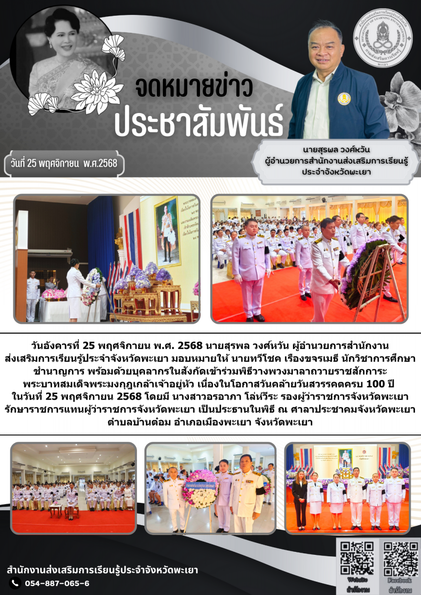 วันอังคารที่ 25 พฤศจิกายน พ.ศ. 2568 นายสุรพล วงศ์หวัน ผู้อำนวยการสำนักงานส่งเสริมการเรียนรู้ประจำจังหวัดพะเยา มอบหมายให้ นายทวีโชค เรืองขจรเมธี นักวิชาการศึกษาชำนาญการ พร้อมด้วยบุคลากรในสังกัดเข้าร่วมพิธีวางพวงมาลาถวายราชสักการะพระบาทสมเด็จพระมงกุฎเกล้าเจ้าอยู่หัว เนื่องในโอกาสวันคล้ายวันสวรรคตครบ 100 ปี ในวันที่ 25 พฤศจิกายน 2568 โดยมี นางสาวอรอาภา โล่ห์วีระ รองผู้ว่าราชการจังหวัดพะเยา รักษาราชการแทนผู้ว่าราชการจังหวัดพะเยา เป็นประธานในพิธี ณ ศาลาประชาคมจังหวัดพะเยา ตำบลบ้านต๋อม อำเภอเมืองพะเยา จังหวัดพะเยา