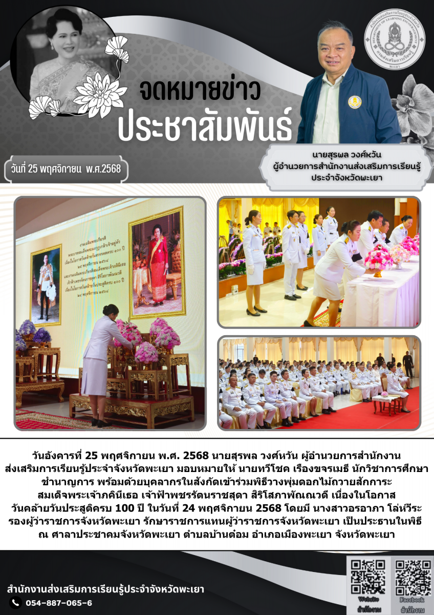 วันอังคารที่ 25 พฤศจิกายน พ.ศ. 2568 นายสุรพล วงศ์หวัน ผู้อำนวยการสำนักงานส่งเสริมการเรียนรู้ประจำจังหวัดพะเยา มอบหมายให้ นายทวีโชค เรืองขจรเมธี นักวิชาการศึกษาชำนาญการ พร้อมด้วยบุคลากรในสังกัดเข้าร่วมพิธีวางพุ่มดอกไม้ถวายสักการะสมเด็จพระเจ้าภคินีเธอ เจ้าฟ้าพชรรัตนราชสุดา สิริโสภาพัณณวดี เนื่องในโอกาสวันคล้ายวันประสูติครบ 100 ปี ในวันที่ 24 พฤศจิกายน 2568 โดยมี นางสาวอรอาภา โล่ห์วีระ รองผู้ว่าราชการจังหวัดพะเยา รักษาราชการแทนผู้ว่าราชการจังหวัดพะเยา เป็นประธานในพิธี ณ ศาลาประชาคมจังหวัดพะเยา ตำบลบ้านต๋อม อำเภอเมืองพะเยา จังหวัดพะเยา