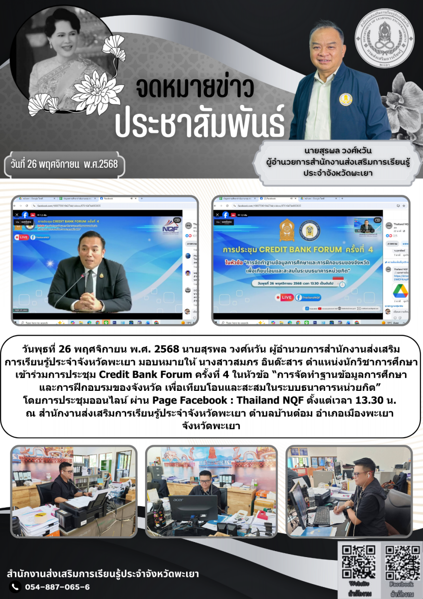 วันพุธที่ 26 พฤศจิกายน พ.ศ. 2568 นายสุรพล วงศ์หวัน ผู้อำนวยการสำนักงานส่งเสริมการเรียนรู้ประจำจังหวัดพะเยา มอบหมายให้ นางสาวสมภร อินต๊ะสาร ตำแหน่งนักวิชาการศึกษา เข้าร่วมการประชุม Credit Bank Forum ครั้งที่ 4 ในหัวข้อ “การจัดทำฐานข้อมูลการศึกษาและการฝึกอบรมของจังหวัด เพื่อเทียบโอนและสะสมในระบบธนาคารหน่วยกิต” โดยการประชุมออนไลน์ ผ่าน Page Facebook : Thailand NQF ตั้งแต่เวลา 13.30 น. ณ สำนักงานส่งเสริมการเรียนรู้ประจำจังหวัดพะเยา ตำบลบ้านต๋อม อำเภอเมืองพะเยา จังหวัดพะเยา