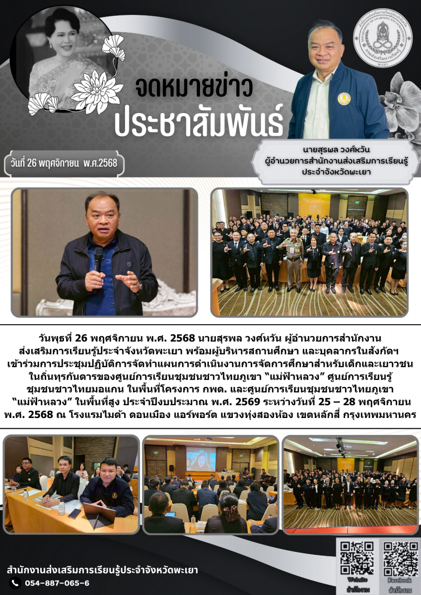 วันพุธที่ 26 พฤศจิกายน พ.ศ. 2568 นายสุรพล วงศ์หวัน ผู้อำนวยการสำนักงานส่งเสริมการเรียนรู้ประจำจังหวัดพะเยา พร้อมผู้บริหารสถานศึกษา และบุคลากรในสังกัดฯ เข้าร่วมการประชุมปฏิบัติการจัดทำแผนการดำเนินงานการจัดการศึกษาสำหรับเด็กและเยาวชนในถิ่นทุรกันดารของศูนย์การเรียนชุมชนชาวไทยภูเขา “แม่ฟ้าหลวง” ศูนย์การเรียนรู้ชุมชนชาวไทยมอแกน ในพื้นที่โครงการ กพด. และศูนย์การเรียนชุมชนชาวไทยภูเขา “แม่ฟ้าหลวง” ในพื้นที่สูง ประจำปีงบประมาณ พ.ศ. 2569 ระหว่างวันที่ 25 – 28 พฤศจิกายน พ.ศ. 2568 ณ โรงแรมไมด้า ดอนเมือง แอร์พอร์ต แขวงทุ่งสองห้อง เขตหลักสี่ กรุงเทพมหานคร