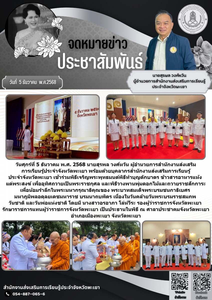 วันศุกร์ที่ 5 ธันวาคม พ.ศ. 2568 นายสุรพล วงศ์หวัน ผู้อำนวยการสำนักงานส่งเสริมการเรียนรู้ประจำจังหวัดพะเยา พร้อมด้วยบุคลากรสำนักงานส่งเสริมการเรียนรู้ประจำจังหวัดพะเยา เช้าร่วมพิธีเจริญพระพุทธมนต์พิธีทำบุญตักบาตร ข้าวสารอาหารแห้ง แด่พระสงฆ์ เพื่ออุทิศถวายเป็นพระราชกุศล และพิธีวางพานพุ่มดอกไม้และถวายราชสักการะ เพื่อน้อมรำลึกในพระมหากรุณาธิคุณของ พระบาทสมเด็จพระบรมชนกาธิเบศร มหาภูมิพลอดุลยเดชมหาราช บรมนาถบพิตร เนื่องในวันคล้ายวันพระบรมราชสมภพ วันชาติ และ วันพ่อแห่งชาติ โดยมี นางสาวอรอาภา โล่ห์วีระ รองผู้ว่าราชการจังหวัดพะเยา รักษาราชการแทนผู้ว่าราชการจังหวัดพะเยา เป็นประธานในพิธี ณ ศาลาประชาคมจังหวัดพะเยา อำเภอเมืองพะเยา จังหวัดพะเยา