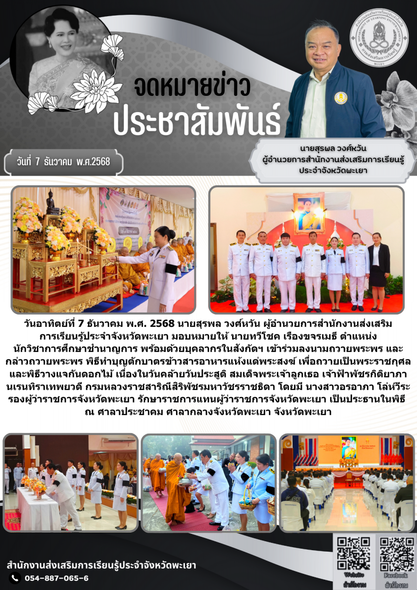 วันอาทิตย์ที่ 7 ธันวาคม พ.ศ. 2568 นายสุรพล วงศ์หวัน ผู้อำนวยการสำนักงานส่งเสริมการเรียนรู้ประจำจังหวัดพะเยา มอบหมายให้ นายทวีโชค เรืองขจรเมธี ตำแหน่งนักวิชาการศึกษาชำนาญการ พร้อมด้วย บุคลากรในสังกัดฯ เข้าร่วมลงนามถวายพระพร และกล่าวถวายพระพร พิธีทำบุญตักบาตรข้าวสารอาหารแห้งแด่พระสงฆ์ เพื่อถวายเป็นพระราชกุศล และพิธีวางแจกันดอกไม้ เนื่องในวันคล้ายวันประสูติ สมเด็จพระเจ้าลูกเธอ เจ้าฟ้าพัชรกิติยาภา นเรนทิราเทพยวดี กรมหลวงราชสาริณีสิริพัชรมหาวัชรราชธิดา โดยมี นางสาวอรอาภา โล่ห์วีระ รองผู้ว่าราชการจังหวัดพะเยา รักษาราชการแทนผู้ว่าราชการจังหวัดพะเยา เป็นประธานในพิธี ณ ศาลาประชาคม ศาลากลางจังหวัดพะเยา จังหวัดพะเยา