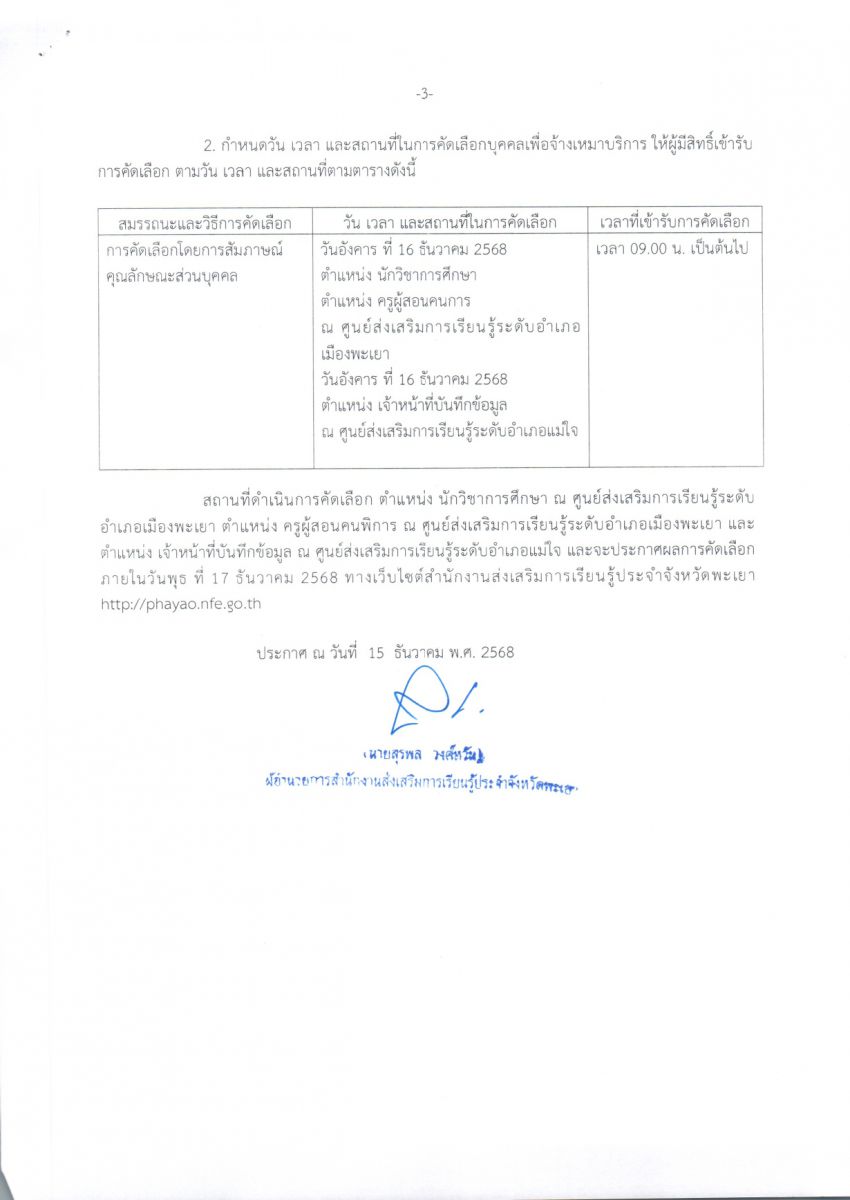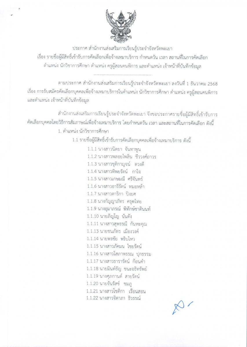 กิจกรรม : ประกาศ สำนักงานส่งเสริมการเรียนรู้ประจำจังหวัดพะเยา เรื่อง รายชื่อผู้มีสิทธิ์เข้ารับการคัดเลือกเพื่อจ้างเหมาบริการ กำหนดวัน เวลา สถานที่ในการคัดเลือก ตำแหน่ง นักวิชาการศึกษา ตำแหน่ง ครูผู้สอนคนพิการ และตำแหน่ง เจ้าหน้าที่บันทึกข้อมูล