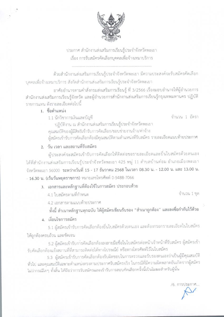 กิจกรรม : ประกาศ สำนักงานส่งเสริมการเรียนรู้ประจำจังหวัดพะเยา เรื่อง การรับสมัครคัดเลือกบุคคลเพื่อจ้างเหมาบริการ ตำแหน่ง นักวิชาการเงินและบัญชี