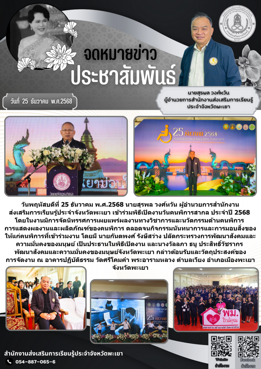 วันพฤหัสบดีที่ 25 ธันวาคม พ.ศ.2568 นายสุรพล วงศ์หวัน ผู้อำนวยการสำนักงานส่งเสริมการเรียนรู้ประจำจังหวัดพะเยา เข้าร่วมพิธีเปิดงานวันคนพิการสากล ประจำปี 2568 โดยในงานมิการจัดนิทรรศการเผยแพร่ผลงานทางวิชาการและนวัตกรรมด้านคนพิการ การแสดงผลงานและผลิตภัณฑ์ของคนพิการ ตลอดจนกิจกรรมนันทนาการและการมอบสิ่งของให้แก่คนพิการที่เข้าร่วมงาน โดยมี นายกันตพงศ์ รังษีสว่าง ปลัดกระทรวงการพัฒนาสังคมและความมั่นคงของมนุษย์ เป็นประธานในพิธีเปิดงาน และนางวัลลภา ธนู ประสิทธิ์วัชรากร พัฒนาสังคมและความมั่นคงของมนุษย์จังหวัดพะเยา กล่าวต้อนรับและวัตถุประสงค์ของการจัดงาน ณ อาคารปฏิบัติธรรม วัดศรีโคมคำ พระอารามหลวง ตำบลเวียง อำเภอเมืองพะเยา จังหวัดพะเยา