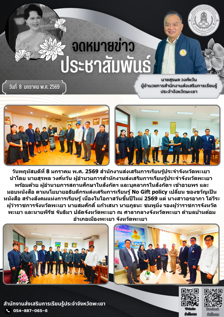 วันพฤหัสบดีที่ 8 มกราคม พ.ศ. 2569 สำนักงานส่งเสริมการเรียนรู้ประจำจังหวัดพะเยา นำโดย นายสุรพล วงศ์หวัน ผู้อำนวยการสำนักงานส่งเสริมการเรียนรู้ประจำจังหวัดพะเยา พร้อมด้วย ผู้อำนวยการสถานศึกษาในสังกัดฯ และบุคลากรในสังกัดฯ เข้าอวยพร และมอบหนังสือ ตามนโยบายอธิบดีกรมส่งเสริมการเรียนรู้ No Gift policy เปลี่ยน ของขวัญ เป็น หนังสือ สร้างสังคมแห่งการเรียนรู้ เนื่องในโอกาสวันขึ้นปีใหม่ 2569 แด่ นางสาวอรอาภา โล่วีระ ผู้ว่าราชการจังหวัดพะเยา นายสมศักดิ์ แก้วเสนา นายภูธนะ ชมพูมิ่ง รองผู้ว่าราชการจังหวัดพะเยา และนายพีรัช จันธิมา ปลัดจังหวัดพะเยา ณ ศาลากลางจังหวัดพะเยา ตำบลบ้านต๋อม อำเภอเมืองพะเยา จังหวัดพะเยา