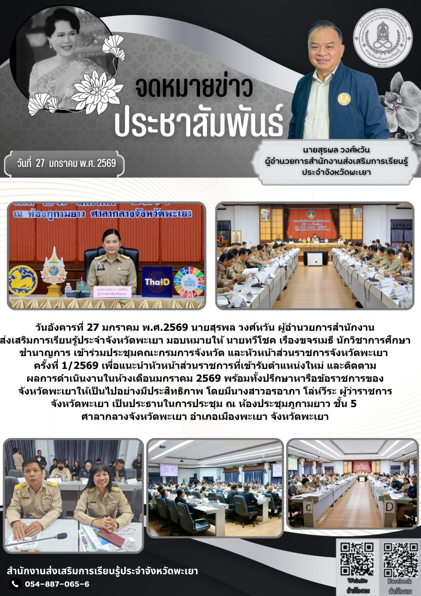 วันอังคารที่ 27 มกราคม พ.ศ.2569 นายสุรพล วงศ์หวัน ผู้อำนวยการสำนักงานส่งเสริมการเรียนรู้ประจำจังหวัดพะเยา มอบหมายให้ นายทวีโชค เรืองขจรเมธี นักวิชาการศึกษาชำนาญการ เข้าร่วมประชุมคณะกรมการจังหวัด และหัวหน้าส่วนราชการจังหวัดพะเยา ครั้งที่ 1/2569 เพื่อแนะนำหัวหน้าส่วนราชการที่เข้ารับตำแหน่งใหม่ และติดตามผลการดำเนินงานในห้วงเดือนมกราคม 2569 พร้อมทั้งปรึกษาหารือข้อราชการของจังหวัดพะเยาให้เป็นไปอย่างมีประสิทธิภาพ โดยมีนางสาวอรอาภา โล่ห์วีระ ผู้ว่าราชการจังหวัดพะเยา เป็นประธานในการประชุม ณ ห้องประชุมภูกามยาว ชั้น 5 ศาลากลางจังหวัดพะเยา อำเภอเมืองพะเยา จังหวัดพะเยา