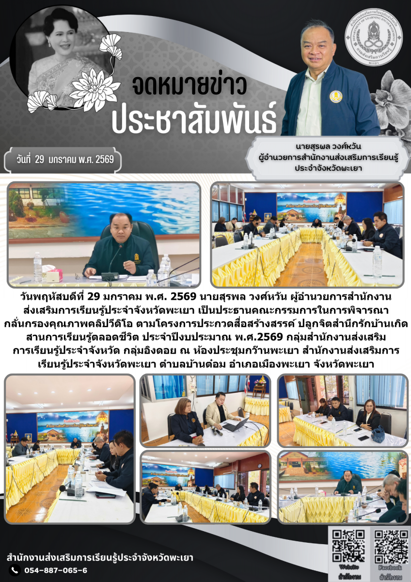วันพฤหัสบดีที่ 29 มกราคม พ.ศ. 2569 นายสุรพล วงศ์หวัน ผู้อำนวยการสำนักงานส่งเสริมการเรียนรู้ประจำจังหวัดพะเยา เป็นประธานคณะกรรมการในการพิจารณากลั่นกรองคุณภาพคลิปวีดิโอ ตามโครงการประกวดสื่อสร้างสรรค์ ปลูกจิตสำนึกรักบ้านเกิด สานการเรียนรู้ตลอดชีวิต ประจำปีงบประมาณ พ.ศ.2569 กลุ่มสำนักงานส่งเสริมการเรียนรู้ประจำจังหวัด กลุ่มอิงดอย ณ ห้องประชุมกว๊านพะเยา สำนักงานส่งเสริมการเรียนรู้ประจำจังหวัดพะเยา ตำบลบ้านต๋อม อำเภอเมืองพะเยา จังหวัดพะเยาโดยมี นางสาวรติรัตน์ อินต์ธะวิชัย รองผู้อำนวยการสำนักงาน สกร.ประจำจังหวัดแพร่ เป็นประธานกรรมการ, นายภัคพงษ์ สีหราช ศึกษานิเทศ สำนักงาน สกร.ประจำจังหวัดน่าน, นายพิพักษ์พงษ์ เต็มใจ ครูโรงเรียนฟากกว๊านวิทยาคม, นายเกรียงศักดิ์ ยุทโท ผู้อำนวยการ สกร.ระดับอำเภอแม่ลาว และนายณัฐวุฒิ ศรีสุวรรณ์ เป็นคณะกรรมการพิจารณากลั่นกรองคุณภาพฯ ประเภท นักศึกษา และนายถนอม โรจน์จรูญหิรัณย์ ผู้อำนวยการ สกร.ระดับอำเภอดอกคำใต้ เป็นประธานกรรมการ, นายธีรวุฒิ วังแก้ว ผู้อำนวยการ สกร.ระดับอำเภอหมองม่วงไข่, นางสาวขวัญดารินทร์ จิตหาญ ครูชำนาญการพิเศษ, นางสาวศุภลักษณ์ เธียรเรืองนนท์ ผู้อำนวยการ สกร.ระดับอำเภอเทิง, และนายวีรณัฐ บุญเรือง นักวิเคราะห์นโยบายและแผน เป็นคณะกรรมการพิจารณากลั่นกรองคุณภาพฯ ประเภทบุคลากร