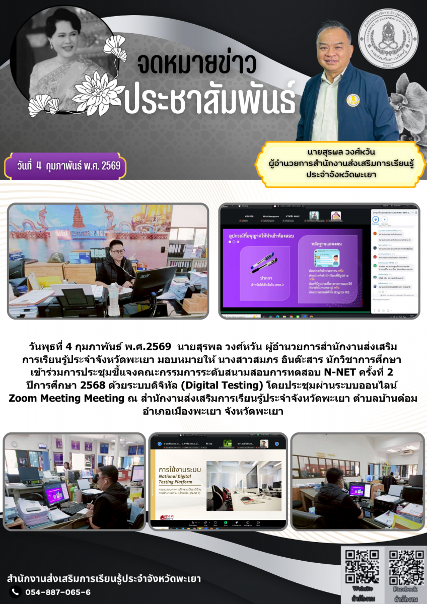 วันพุธที่ 4 กุมภาพันธ์ พ.ศ.2569 นายสุรพล วงศ์หวัน ผู้อำนวยการสำนักงานส่งเสริมการเรียนรู้ประจำจังหวัดพะเยา มอบหมายให้ นางสาวสมภร อินต๊ะสาร นักวิชาการศึกษา เข้าร่วมการประชุมชี้แจงคณะกรรมการระดับสนามสอบการทดสอบ N-NET ครั้งที่ 2 ปีการศึกษา 2568 ด้วยระบบดิจิทัล (Digital Testing) โดยประชุมผ่านระบบออนไลน์ Zoom Meeting Meeting ณ สำนักงานส่งเสริมการเรียนรู้ประจำจังหวัดพะเยา ตำบลบ้านต๋อม อำเภอเมืองพะเยา จังหวัดพะเยา