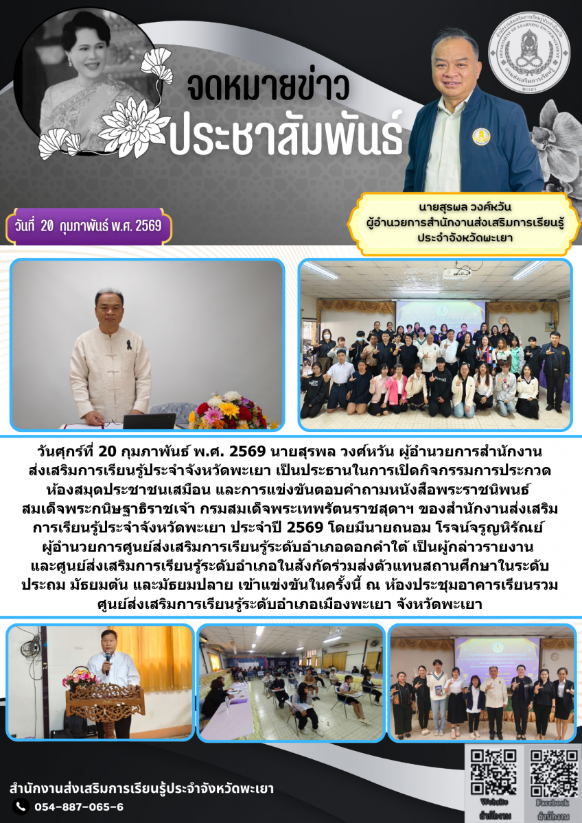 วันศุกร์ที่ 20 กุมภาพันธ์ พ.ศ. 2569 นายสุรพล วงศ์หวัน ผู้อำนวยการสำนักงานส่งเสริมการเรียนรู้ประจำจังหวัดพะเยา เป็นประธานในการเปิดกิจกรรมการประกวดห้องสมุดประชาชนเสมือน และการแข่งขันตอบคำถามหนังสือพระราชนิพนธ์ สมเด็จพระกนิษฐาธิราชเจ้า กรมสมเด็จพระเทพรัตนราชสุดาฯ ของสำนักงานส่งเสริมการเรียนรู้ประจำจังหวัดพะเยา ประจำปี 2569 โดยมีนายถนอม โรจน์จรูญหิรัณย์ ผู้อำนวยการศูนย์ส่งเสริมการเรียนรู้ระดับอำเภอดอกคำใต้ เป็นผู้กล่าวรายงาน และศูนย์ส่งเสริมการเรียนรู้ระดับอำเภอในสังกัดร่วมส่งตัวแทนสถานศึกษาในระดับประถม มัธยมต้น และมัธยมปลาย เข้าแข่งขันในครั้งนี้ ณ ห้องประชุมอาคารเรียนรวม ศูนย์ส่งเสริมการเรียนรู้ระดับอำเภอเมืองพะเยา จังหวัดพะเยา