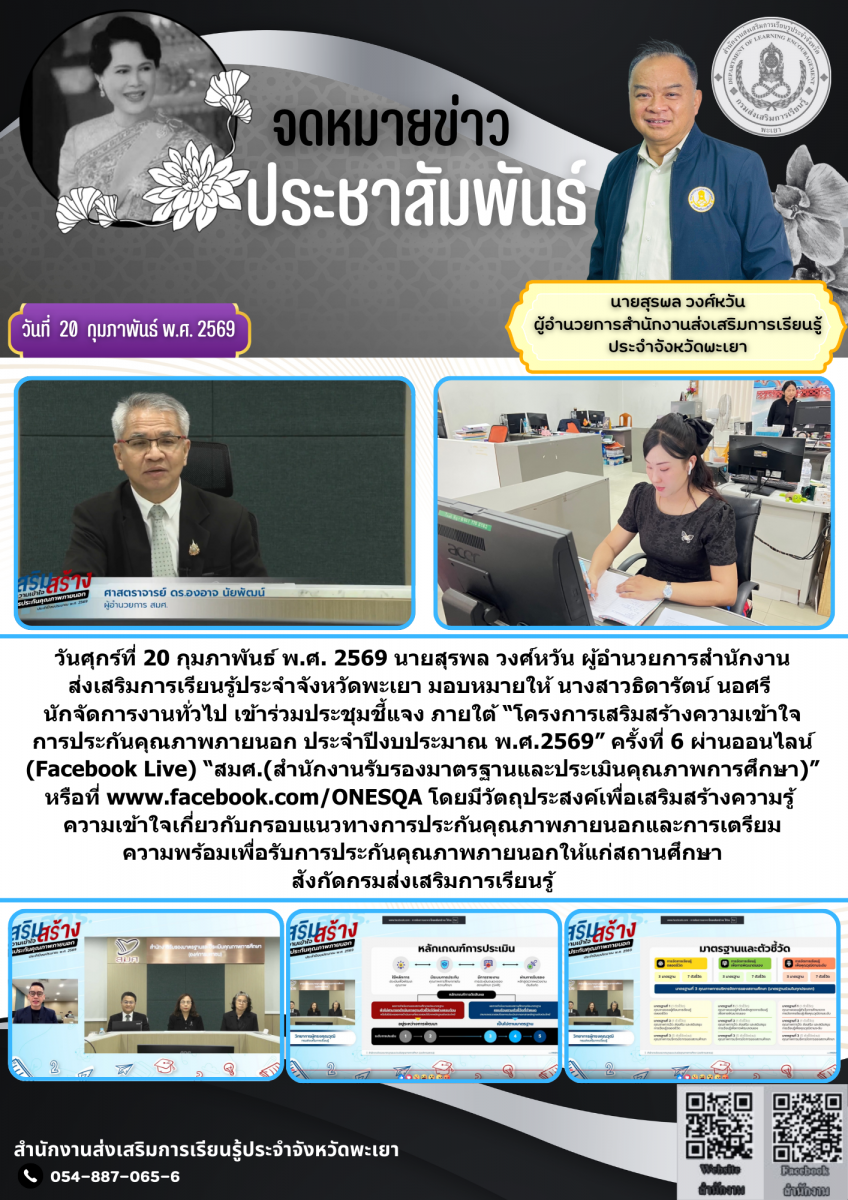วันศุกร์ที่ 20 กุมภาพันธ์ พ.ศ. 2569 นายสุรพล วงศ์หวัน ผู้อำนวยการสำนักงานส่งเสริมการเรียนรู้ประจำจังหวัดพะเยา มอบหมายให้ นางสาวธิดารัตน์ นอศรี นักจัดการงานทั่วไป เข้าร่วมประชุมชี้แจง ภายใต้ “โครงการเสริมสร้างความเข้าใจการประกันคุณภาพภายนอก ประจำปีงบประมาณ พ.ศ.2569” ครั้งที่ 6 ผ่านออนไลน์ (Facebook Live) “สมศ.(สำนักงานรับรองมาตรฐานและประเมินคุณภาพการศึกษา)” หรือที่ www.facebook.com/ONESQA โดยมีวัตถุประสงค์เพื่อเสริมสร้างความรู้ ความเข้าใจเกี่ยวกับกรอบแนวทางการประกันคุณภาพภายนอกและการเตรียมความพร้อมเพื่อรับการประกันคุณภาพภายนอกให้แก่สถานศึกษาสังกัดกรมส่งเสริมการเรียนรู้