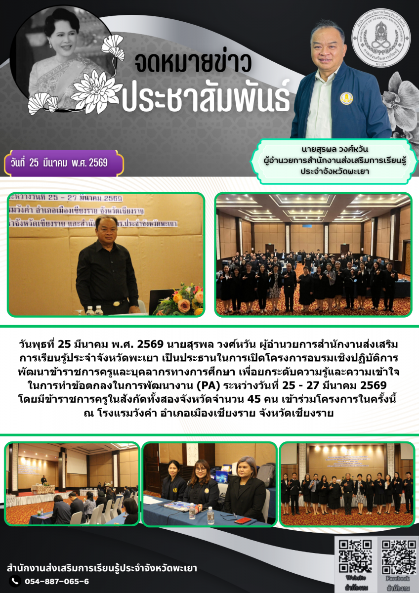 วันพุธที่ 25 มีนาคม พ.ศ. 2569 นายสุรพล วงศ์หวัน ผู้อำนวยการสำนักงานส่งเสริมการเรียนรู้ประจำจังหวัดพะเยา เป็นประธานในการเปิดโครงการอบรมเชิงปฏิบัติการพัฒนาข้าราชการครูและบุคลากรทางการศึกษา เพื่อยกระดับความรู้และความเข้าใจในการทำข้อตกลงในการพัฒนางาน (PA) ระหว่างวันที่ 25 - 27 มีนาคม 2569 โดยมีข้าราชการครูในสังกัดทั้งสองจังหวัดจำนวน 45 คน เข้าร่วมโครงการในครั้งนี้ ณ โรงแรมวังคำ อำเภอเมืองเชียงราย จังหวัดเชียงราย