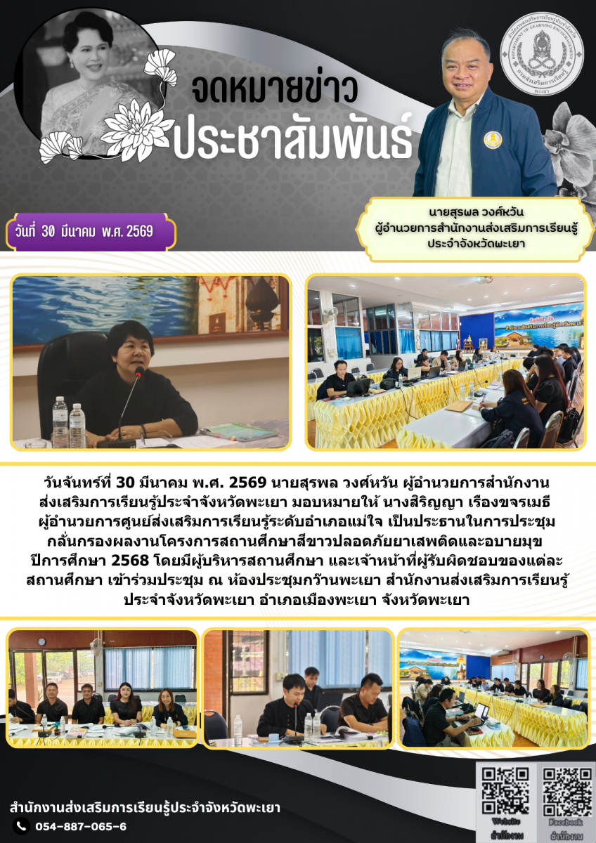 วันจันทร์ที่ 30 มีนาคม พ.ศ. 2569 นายสุรพล วงศ์หวัน ผู้อำนวยการสำนักงานส่งเสริมการเรียนรู้ประจำจังหวัดพะเยา มอบหมายให้ นางสิริญญา เรืองขจรเมธี ผู้อำนวยการศูนย์ส่งเสริมการเรียนรู้ระดับอำเภอแม่ใจ เป็นประธานในการประชุมกลั่นกรองผลงานโครงการสถานศึกษาสีขาวปลอดภัยยาเสพติดและอบายมุข ปีการศึกษา 2568 โดยมีผู้บริหารสถานศึกษา และเจ้าหน้าที่ผู้รับผิดชอบของแต่ละสถานศึกษา เข้าร่วมประชุม ณ ห้องประชุมกว๊านพะเยา สำนักงานส่งเสริมการเรียนรู้ประจำจังหวัดพะเยา อำเภอเมืองพะเยา จังหวัดพะเยา