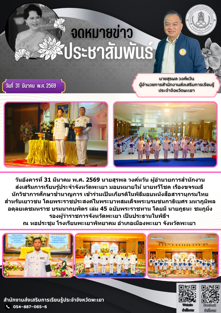 วันอังคารที่ 31 มีนาคม พ.ศ. 2569 นายสุรพล วงศ์หวัน ผู้อำนวยการสำนักงานส่งเสริมการเรียนรู้ประจำจังหวัดพะเยา มอบหมายให้ นายทวีโชค เรืองขจรเมธี นักวิชาการศึกษาชำนาญการ เข้าร่วมเป็นเกียรติในพิธีมอบหนังสือสารานุกรมไทยสำหรับเยาวชน โดยพระราชประสงค์ในพระบาทสมเด็จพระบรมชนกาธิเบศร มหาภูมิพลอดุลยเดชมหราช บรมนาถบพิตร เล่ม 45 ฉบับพระราชทาน โดยมี นายภูธนะ ชมภูมิ่ง รองผู้ว่าราชการจังหวัดพะเยา เป็นประธานในพิธีฯ ณ หอประชุม โรงเรียนพะเยาพิทยาคม อำเภอเมืองพะเยา จังหวัดพะเยา