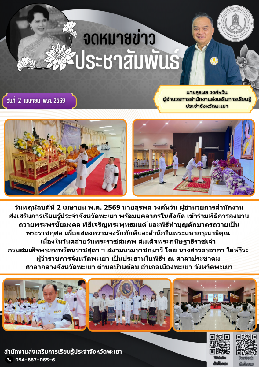 วันพฤหัสบดีที่ 2 เมษายน พ.ศ. 2569 นายสุรพล วงศ์หวัน ผู้อำนวยการสำนักงานส่งเสริมการเรียนรู้ประจำจังหวัดพะเยา พร้อมบุคลากรในสังกัด เข้าร่วมพิธีการลงนามถวายพระพรชัยมงคล พิธีเจริญพระพุทธมนต์ และพิธีทำบุญตักบาตรถวายเป็นพระราชกุศล เพื่อแสดงความจงรักภักดีและสำนึกในพระมหากรุณาธิคุณ เนื่องในวันคล้ายวันพระราชสมภพ สมเด็จพระกนิษฐาธิราชเจ้า กรมสมเด็จพระเทพรัตนราชสุดา ฯ สยามบรมราชกุมารี โดย นางสาวอรอาภา โล่ห์วีระ ผู้ว่าราชการจังหวัดพะเยา เป็นประธานในพิธีฯ ณ ศาลาประชาคม ศาลากลางจังหวัดพะเยา ตำบลบ้านต๋อม อำเภอเมืองพะเยา จังหวัดพะเยา