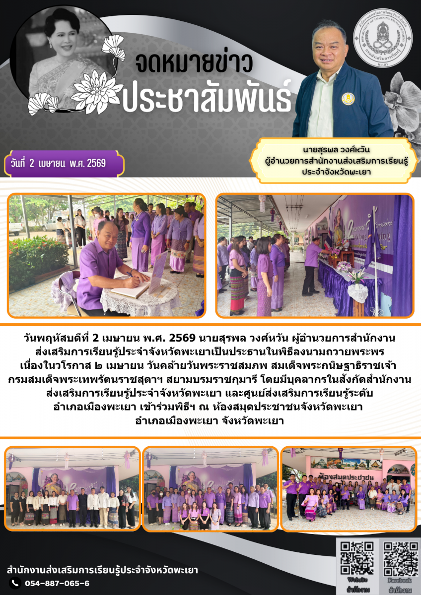 วันพฤหัสบดีที่ 2 เมษายน พ.ศ. 2569 นายสุรพล วงศ์หวัน ผู้อำนวยการสำนักงานส่งเสริมการเรียนรู้ประจำจังหวัดพะเยาเป็นประธานในพิธีลงนามถวายพระพร เนื่องในวโรกาส ๒ เมษายน วันคล้ายวันพระราชสมภพ สมเด็จพระกนิษฐาธิราชเจ้า กรมสมเด็จพระเทพรัตนราชสุดาฯ สยามบรมราชกุมารี โดยมีบุคลากรในสังกัดสำนักงานส่งเสริมการเรียนรู้ประจำจังหวัดพะเยา และศูนย์ส่งเสริมการเรียนรู้ระดับอำเภอเมืองพะเยา เข้าร่วมพิธีฯ ณ ห้องสมุดประชาชนจังหวัดพะเยา อำเภอเมืองพะเยา จังหวัดพะเยา