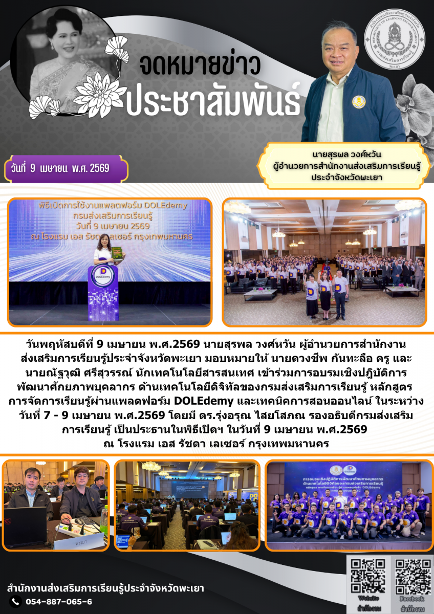 วันพฤหัสบดีที่ 9 เมษายน พ.ศ.2569 นายสุรพล วงศ์หวัน ผู้อำนวยการสำนักงานส่งเสริมการเรียนรู้ประจำจังหวัดพะเยา มอบหมายให้ นายดวงชีพ กันทะลือ ครู และนายณัฐวุฒิ ศรีสุวรรณ์ นักเทคโนโลยีสารสนเทศ เข้าร่วมการอบรมเชิงปฎิบัติการพัฒนาศักยภาพบุคลากร ด้านเทคโนโลยีดิจิทัลของกรมส่งเสริมการเรียนรู้ หลักสูตร การจัดการเรียนรู้ผ่านแพลตฟอร์ม DOLEdemy และเทคนิคการสอนออนไลน์ ในระหว่างวันที่ 7 - 9 เมษายน พ.ศ.2569 โดยมี ดร.รุ่งอรุณ ไสยโสภณ รองอธิบดีกรมส่งเสริมการเรียนรู้ เป็นประธานในพิธีเปิดฯ ในวันที่ 9 เมษายน พ.ศ.2569 ณ โรงแรม เอส รัชดา เลเซอร์ กรุงเทพมหานคร