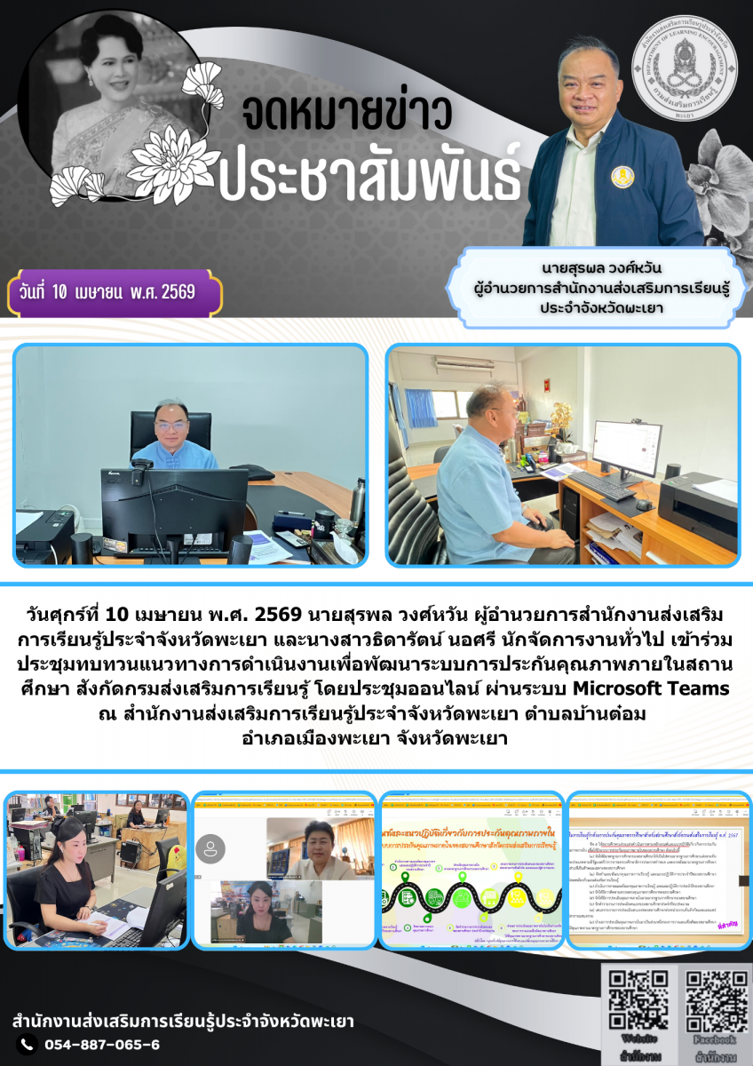 วันศุกร์ที่ 10 เมษายน พ.ศ. 2569 นายสุรพล วงศ์หวัน ผู้อำนวยการสำนักงานส่งเสริมการเรียนรู้ประจำจังหวัดพะเยา และนางสาวธิดารัตน์ นอศรี นักจัดการงานทั่วไป เข้าร่วมประชุมทบทวนแนวทางการดำเนินงานเพื่อพัฒนาระบบการประกันคุณภาพภายในสถานศึกษา สังกัดกรมส่งเสริมการเรียนรู้ โดยประชุมออนไลน์ ผ่านระบบ Microsoft Teams ณ สำนักงานส่งเสริมการเรียนรู้ประจำจังหวัดพะเยา ตำบลบ้านต๋อม อำเภอเมืองพะเยา จังหวัดพะเยา