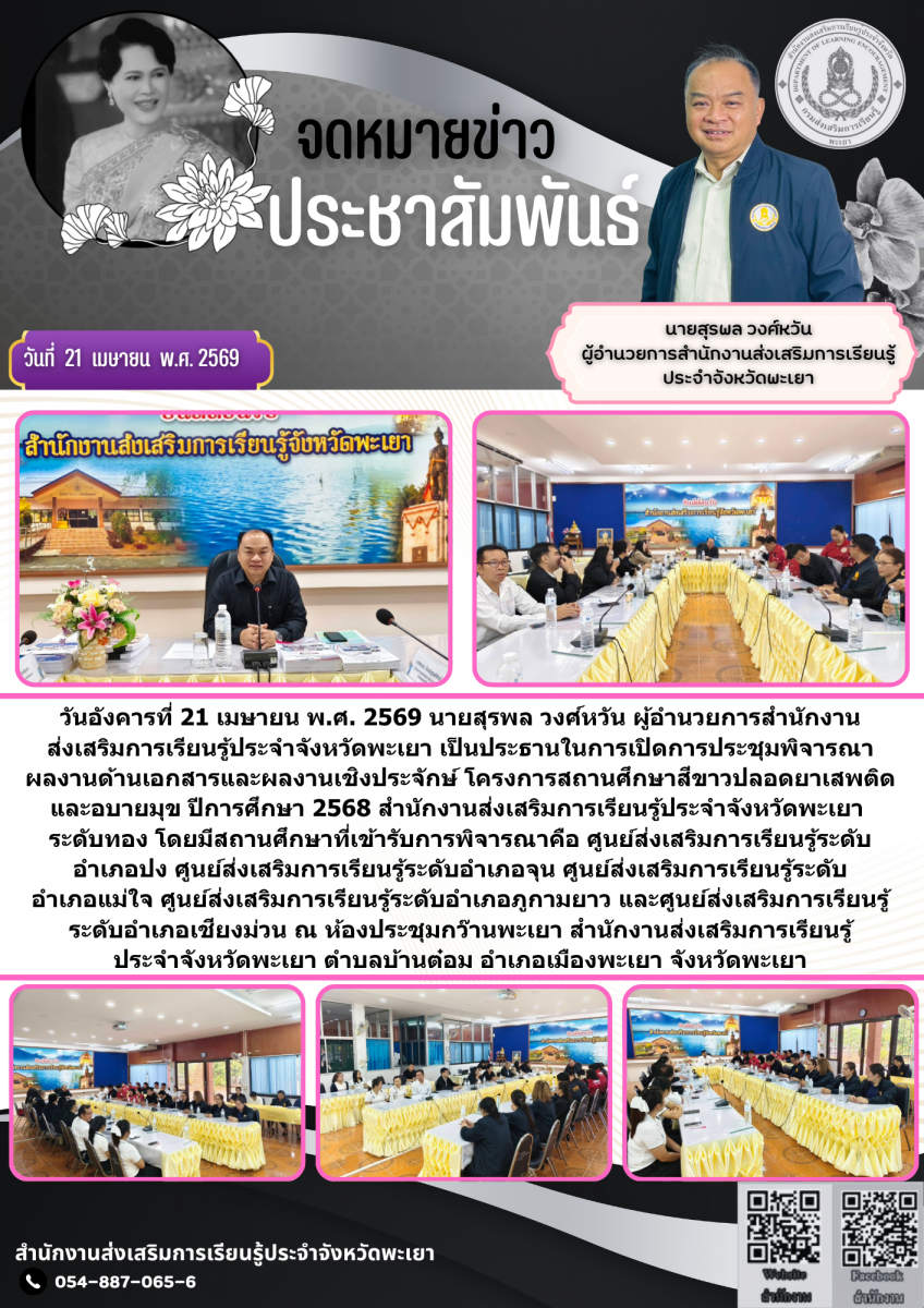 วันอังคารที่ 21 เมษายน พ.ศ. 2569 นายสุรพล วงศ์หวัน ผู้อำนวยการสำนักงานส่งเสริมการเรียนรู้ประจำจังหวัดพะเยา เป็นประธานในการเปิดการประชุมพิจารณาผลงานด้านเอกสารและผลงานเชิงประจักษ์ โครงการสถานศึกษาสีขาวปลอดยาเสพติดและอบายมุข ปีการศึกษา 2568 สำนักงานส่งเสริมการเรียนรู้ประจำจังหวัดพะเยา ระดับทอง โดยมีสถานศึกษาที่เข้ารับการพิจารณาคือ ศูนย์ส่งเสริมการเรียนรู้ระดับอำเภอปง ศูนย์ส่งเสริมการเรียนรู้ระดับอำเภอจุน ศูนย์ส่งเสริมการเรียนรู้ระดับอำเภอแม่ใจ ศูนย์ส่งเสริมการเรียนรู้ระดับอำเภอภูกามยาว และศูนย์ส่งเสริมการเรียนรู้ระดับอำเภอเชียงม่วน ณ ห้องประชุมกว๊านพะเยา สำนักงานส่งเสริมการเรียนรู้ประจำจังหวัดพะเยา ตำบลบ้านต๋อม อำเภอเมืองพะเยา จังหวัดพะเยา