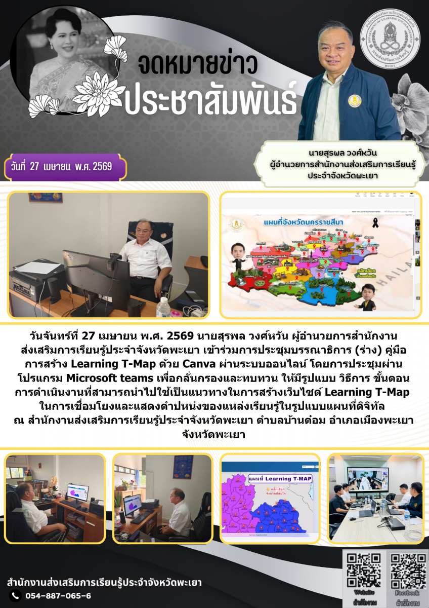 วันจันทร์ที่ 27 เมษายน พ.ศ. 2569 นายสุรพล วงศ์หวัน ผู้อำนวยการสำนักงานส่งเสริมการเรียนรู้ประจำจังหวัดพะเยา เข้าร่วมการประชุมบรรณาธิการ (ร่าง) คู่มือการสร้าง Learning T-Map ด้วย Canva ผ่านระบบออนไลน์ โดยการประชุมผ่านโปรแกรม Microsoft teams เพื่อกลั่นกรองและทบทวน ให้มีรูปแบบ วิธีการ ขั้นตอน การดำเนินงานที่สามารถนำไปใช้เป็นแนวทางในการสร้างเว็บไซด์ Learning T-Map ในการเชื่อมโยงและแสดงตำปหน่งของแหล่งเรียนรู้ในรูปแบบแผนที่ดิจิทัล ณ สำนักงานส่งเสริมการเรียนรู้ประจำจังหวัดพะเยา ตำบลบ้านต๋อม อำเภอเมืองพะเยา จังหวัดพะเยา