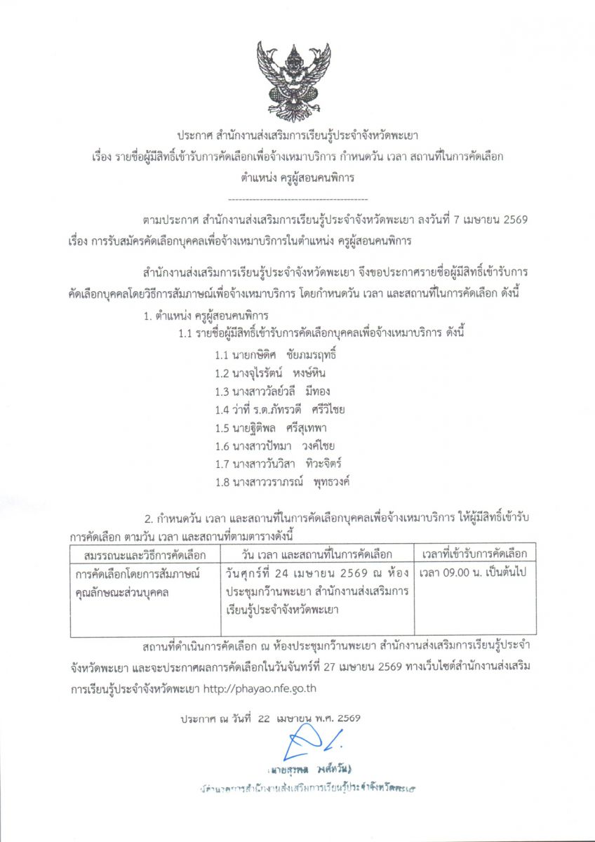 ประกาศ สำนักงานส่งเสริมการเรียนรู้ประจำจังหวัดพะเยา เรื่อง รายชื่อผู้มีสิทธิ์เข...