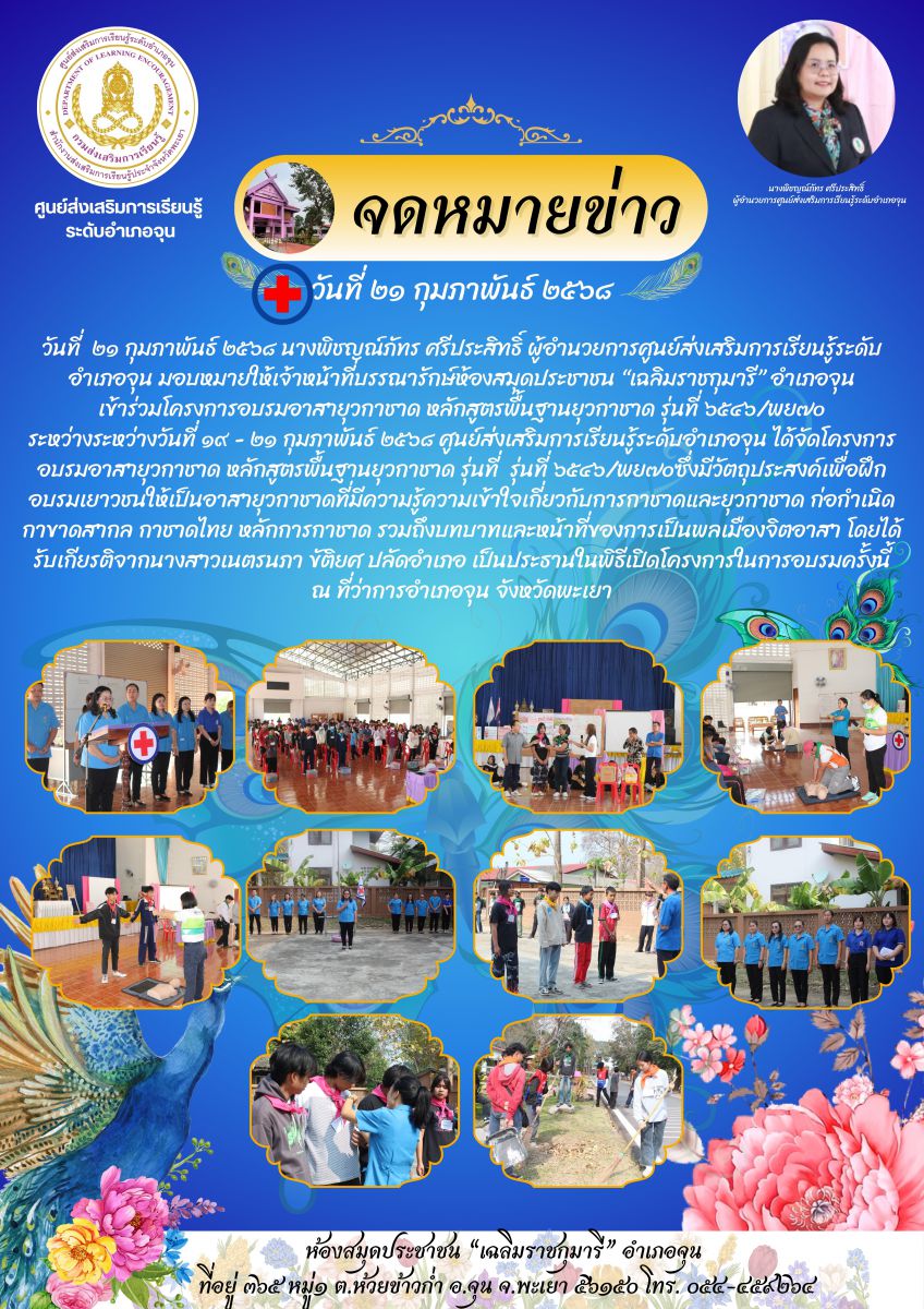เข้าร่วมโครงการอบรมอาสายุวกาชาด หลักสูตรพื้นฐานยุวกาชาด รุ่นที่ ๖๕๔๖/พย๗๐ระหว่างระหว่างวันที่ ๑๙ - ๒๑ กุมภาพันธ์ ๒๕๖๘ ศูนย์ส่งเสริมการเรียนรู้ระดับอำเ...