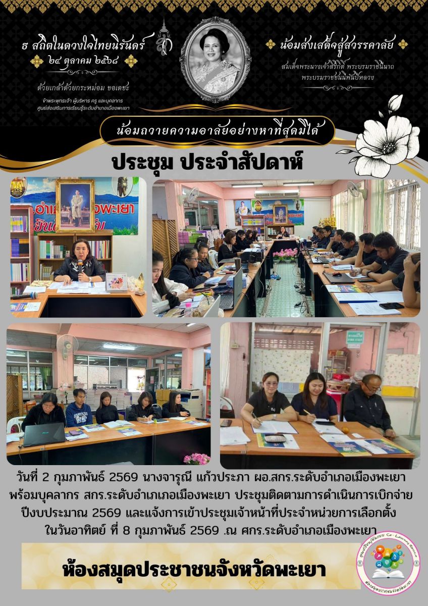 วันที่ 2 กุมภาพันธ์ 2569 นางจารุณี แก้วประภา ผอ.สกร.ระดับอำเภอเมืองพะเยา พร้อมบุคลากร สกร.ระดับอำเภเภอเมืองพะเยา ประชุมติดตามการดำเนินการเบิกจ่ายปีงบป...