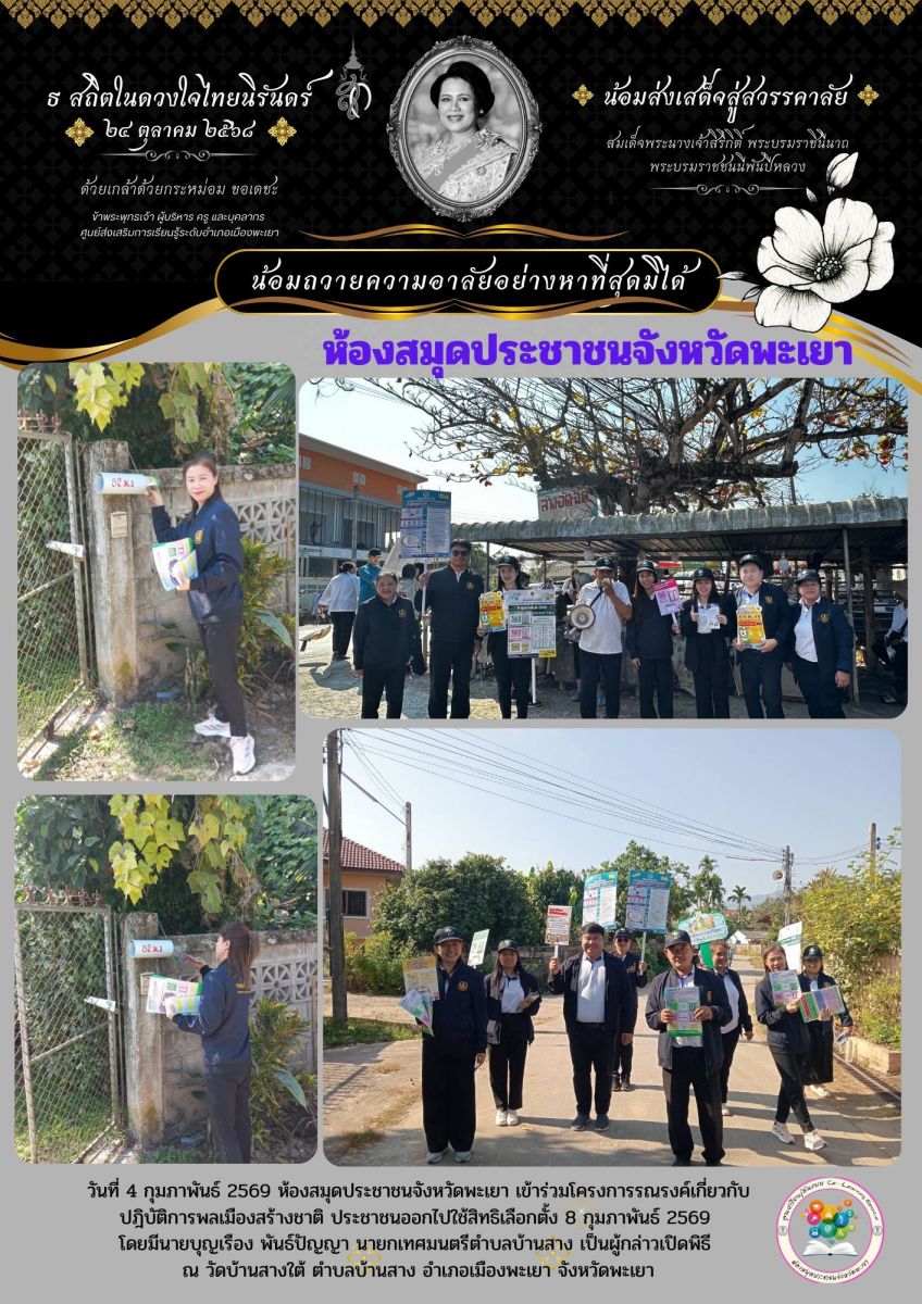 วันที่ 4 กุมภาพันธ์ 2569 ห้องสมุดประชาชนจังหวัดพะเยา เข้าร่วมโครงการรณรงค์เกี่ยวกับปฎิบัติการพลเมืองสร้างชาติ ประชาชนออกไปใช้สิทธิเลือกตั้ง 8 กุมภาพัน...
