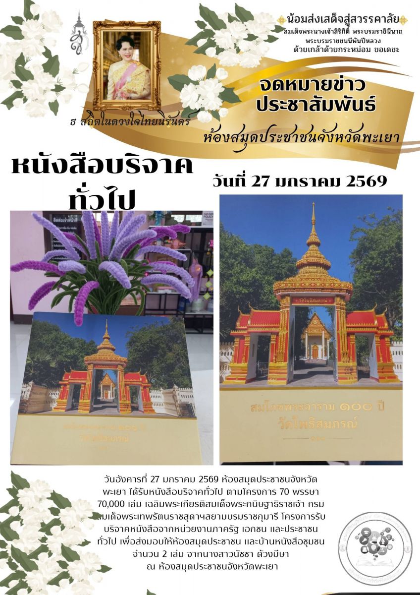 วันอังคารที่ 27 มกราคม 2569 ห้องสมุดประชาชนจังหวัดพะเยา ได้รับหนังสือบริจาคทั่วไป ตามโครงการ 70 พรรษา 70,000 เล่ม เฉลิมพระเกียรติสมเด็จพระกนิษฐาธิราชเ...