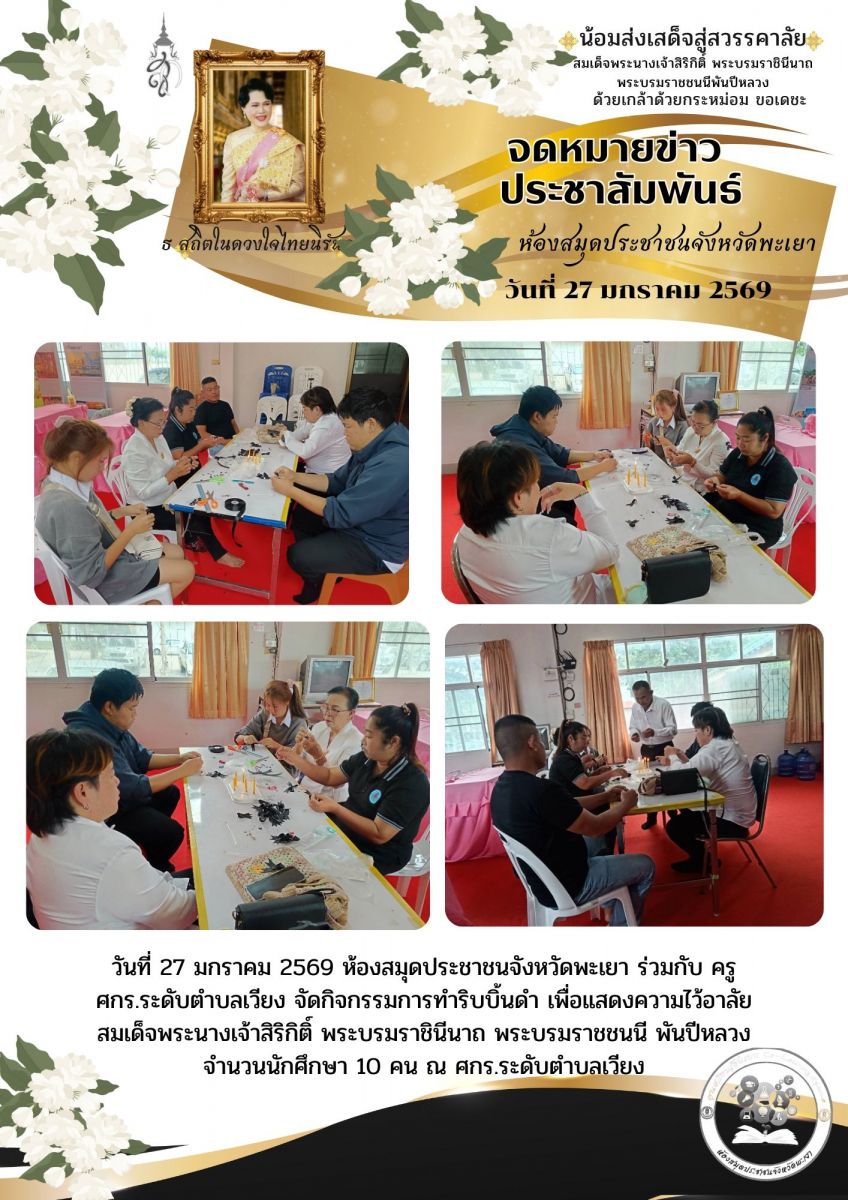 วันที่ 27 มกราคม 2569 ห้องสมุดประชาชนจังหวัดพะเยา ร่วมกับ นายธีราภิวัฒน์ เบิกบาน ครู ศกร.ระดับตำบลเวียง จัดกิจกรรมการอาสาพาทำริบบิ้นดำ เพื่อแสดงความไ...