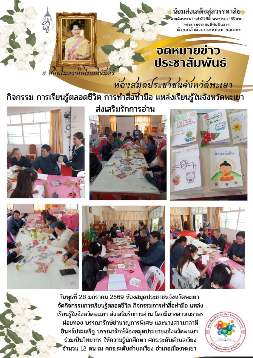 วันพุธที่ 28 มกราคม 2569 ห้องสมุดประชาชนจังหวัดพะเยา จัดกิจกรรมการเรียนรู้ตลอดชีวิต กิจกรรมการทำสื่อทำมือ แหล่งเรียนรู้ในจังหวัดพะเยา ส่งเสริมรักการอ...