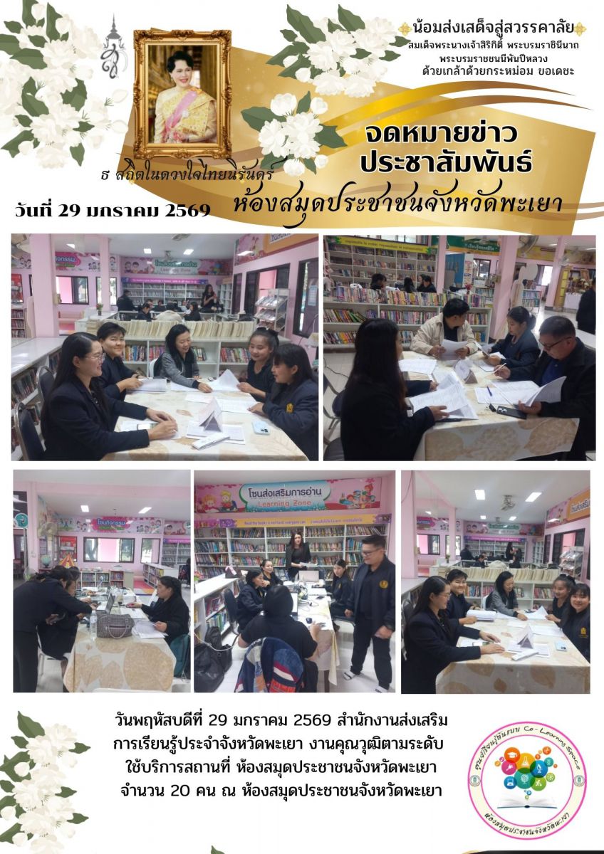 วันพฤหัสบดีที่ 29 มกราคม 2569 สำนักงานส่งเสริมการเรียนรู้ประจำจังหวัดพะเยา งานคุณวุฒิตามระดับ ใช้บริการสถานที่ ห้องสมุดประชาชนจังหวัดพะเยา จำนวน 20 คน...