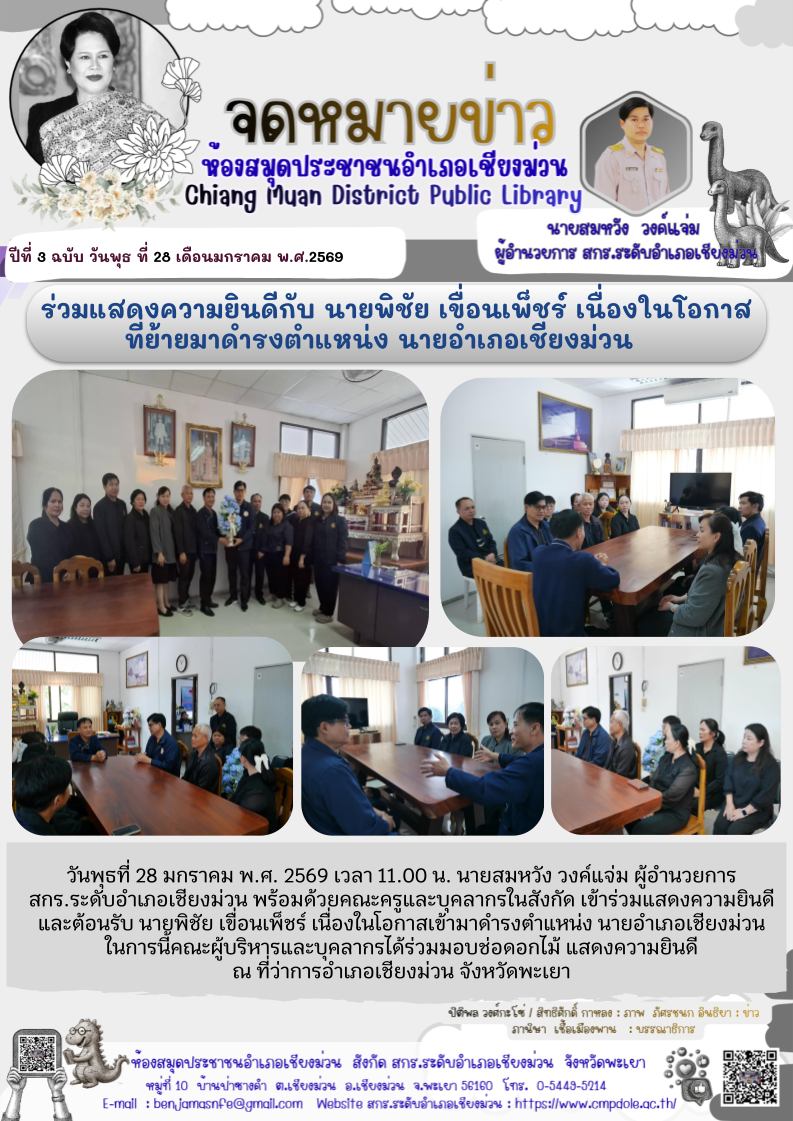 วันพุธที่ 28 มกราคม พ.ศ. 2569 เวลา 11.00 น. นายสมหวัง วงค์แจ่ม ผู้อำนวยการ สกร.ระดับอำเภอเชียงม่วน พร้อมด้วยคณะครูและบุคลากรในสังกัด เข้าร่วมแสดงความ...