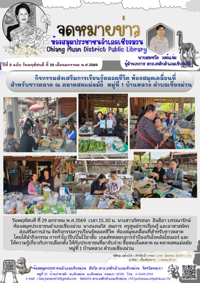 วันพฤหัสบดี ที่ 29 มกราคม พ.ศ.2569 เวลา 15.30 น. นางสาวภัศรชนก อินธิยา บรรณารักษ์ห้องสมุดประชาชนอำเภอเชียงม่วน นางนงนภัส สมภาร ครูศูนย์การเรียนรู...