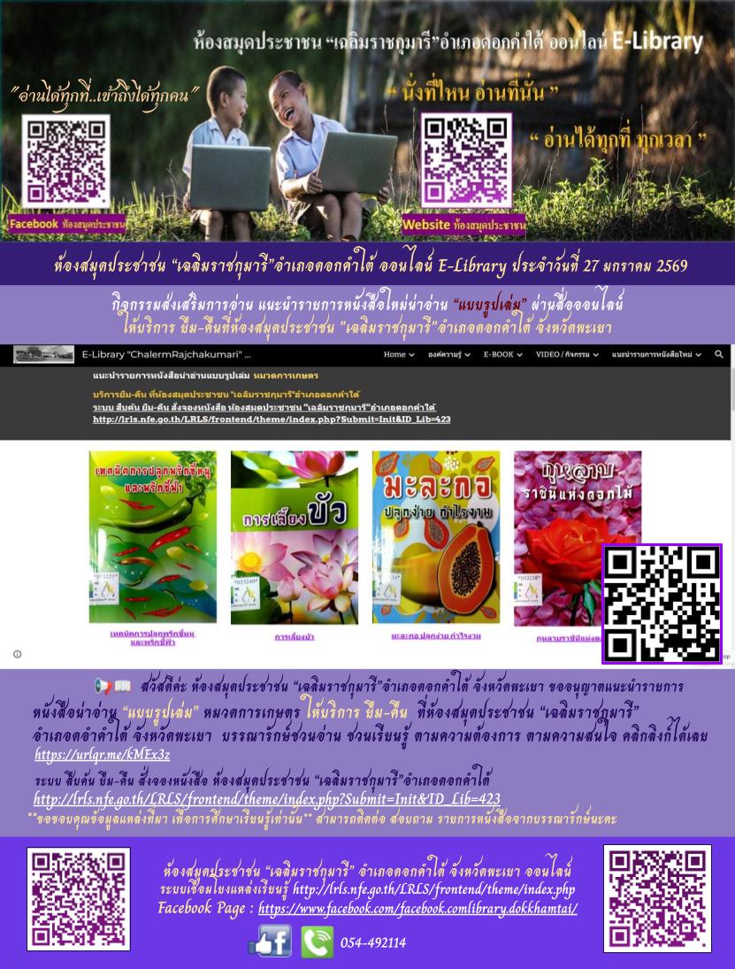 ห้องสมุดประชาชน “เฉลิมราชกุมารี”อำเภอดอกคำใต้ ออนไลน์ E-Library ประจำวันที่ 27 มกราคม 2569...