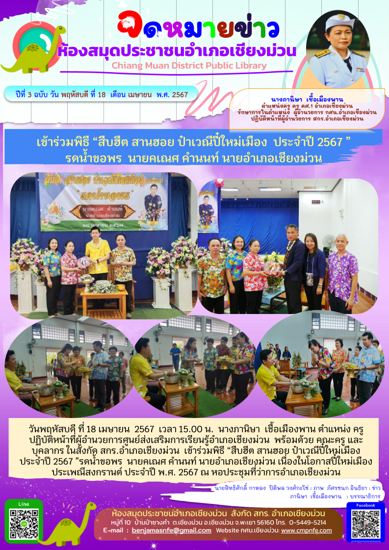 วันที่ 18 เมษายน 2567 เข้าร่วมพิธี “สืบฮีต สานฮอย ป๋าเวณีปี๋ใหม่เมือง ประจำปี 2567 ” รดน้ำขอพร นายคเณศ คำนนท์ นายอำเภอเชียงม่วน ณ หอประชุมที่ว่าการ...