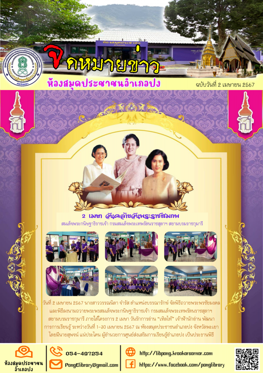 วันที่ 2 เมษายน 2567 จัดนิทรรศการและกิจกรรมส่งเสริมการอ่าน เนื่องในโอกาสวัน คล้ายวันพระราชสมภพสมเด็จพระกนิษฐาธิราชเ...