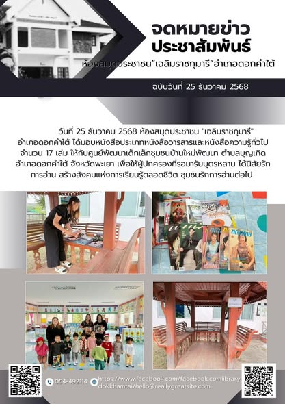 ห้องสมุดประชาชน "เฉลิมราชกุมารี" อำเภอดอกคำใต้ ได้มอบหนังสือประเภทหนังสือวารสารและหนังสือความรู้ทั่วไป จำนวน 17 เล่ม ให้กับศูนย์พัฒนาเด็กเล็กชุมชนบ้าน...
