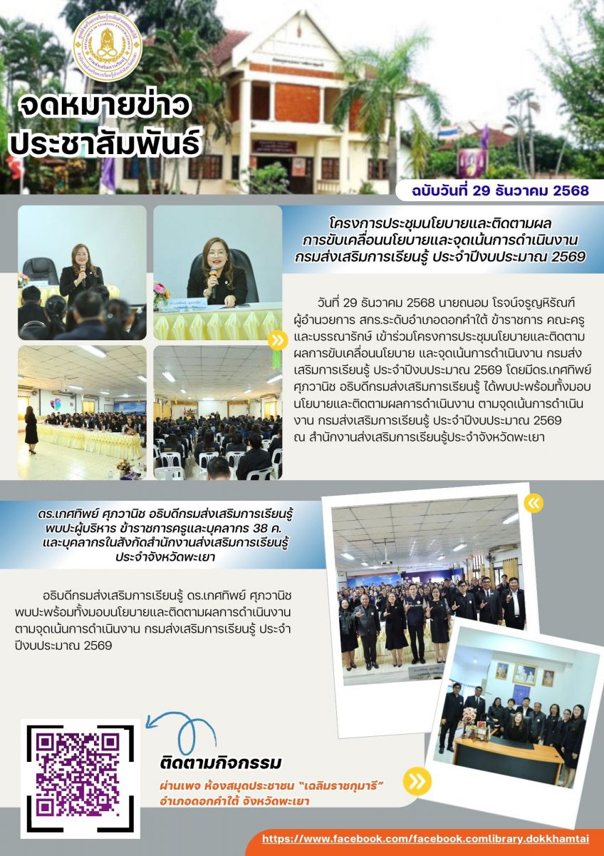 วันจันทร์ ที่ 29 ธันวาคม 2568 ดร.เกศทิพย์ ศุภวานิช อธิบดีกรมส่งเสริมการเรียนรู้ ได้ให้เกียรติเข้าเยี่ยมชมห้องสมุดประชาชนจังหวัดพะเยา โดยมี ผอ.จารุณี แ...
