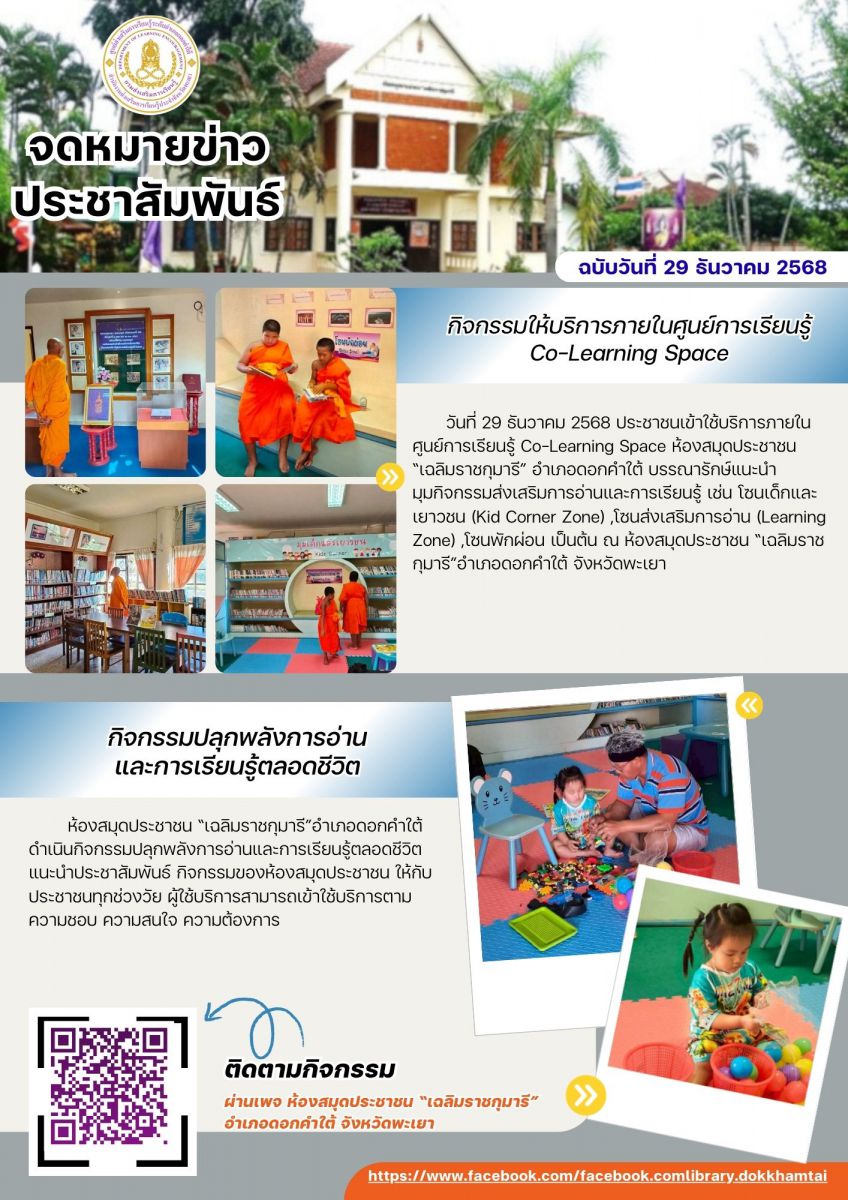 กิจกรรมให้บริการภายในศูนย์การเรียนรู้ Co-Learning Space และกิจกรรมปลุกพลังการอ่านและการเรียนรู้ตลอดชีวิตความอาลัย...