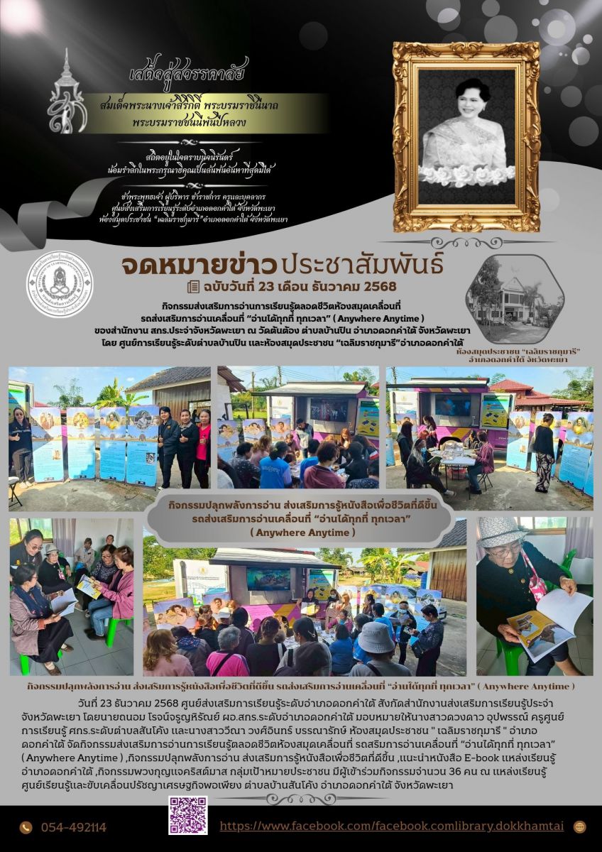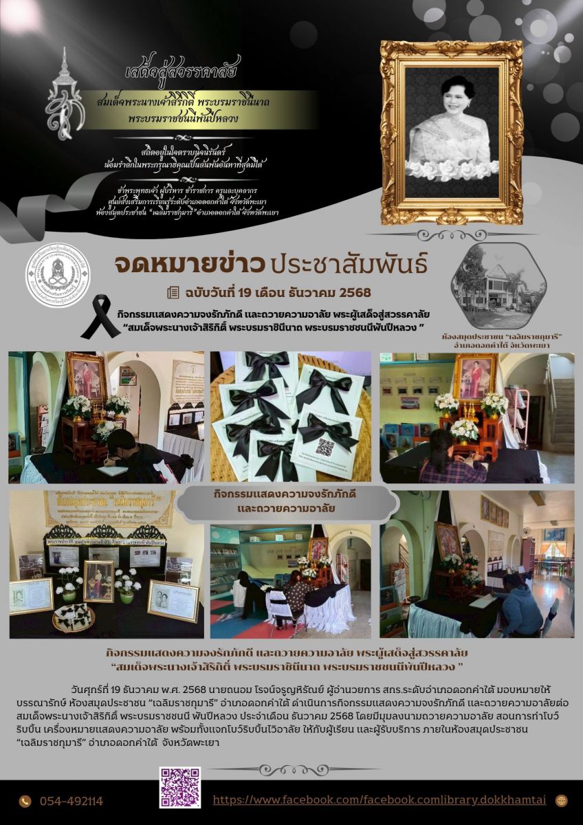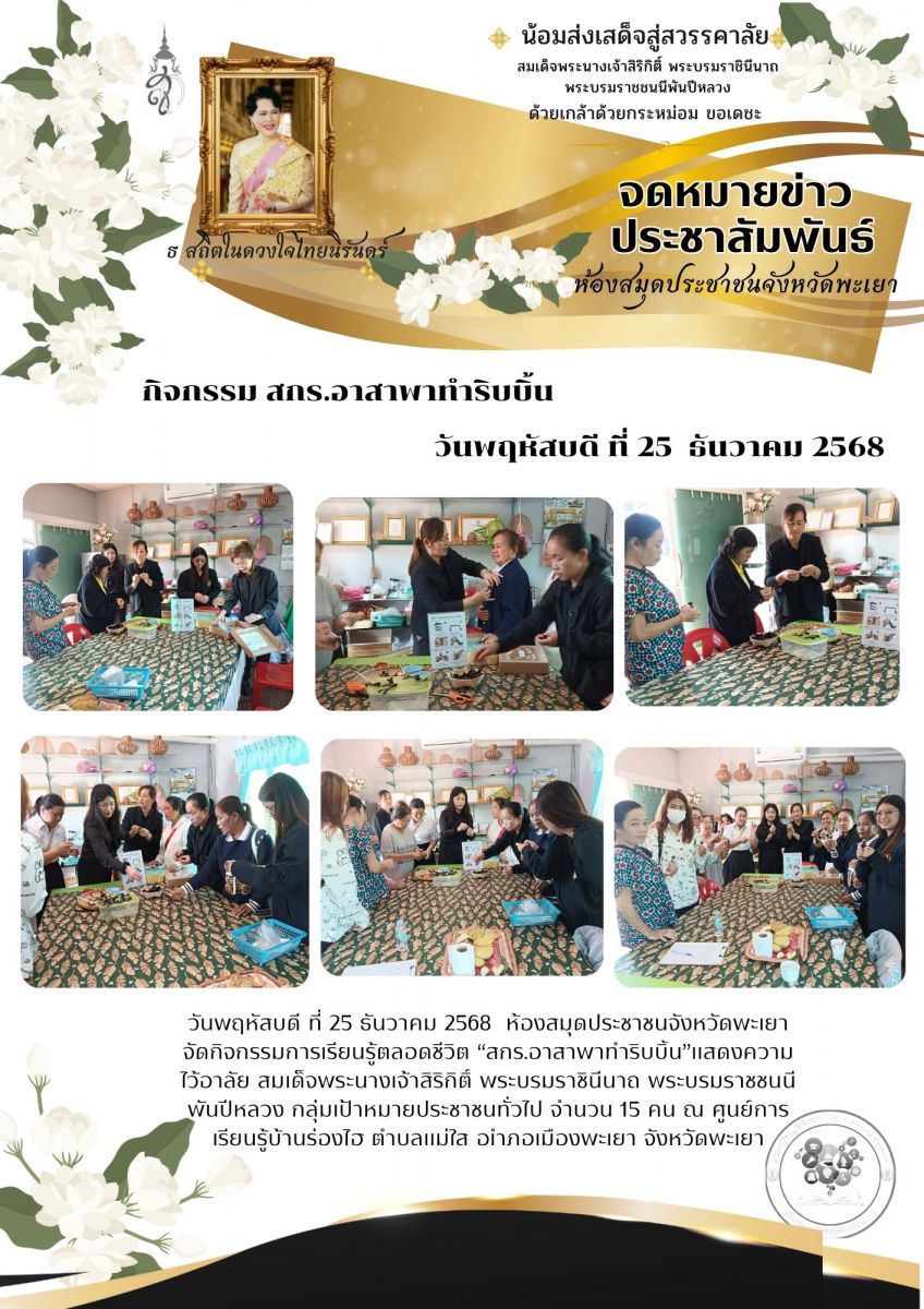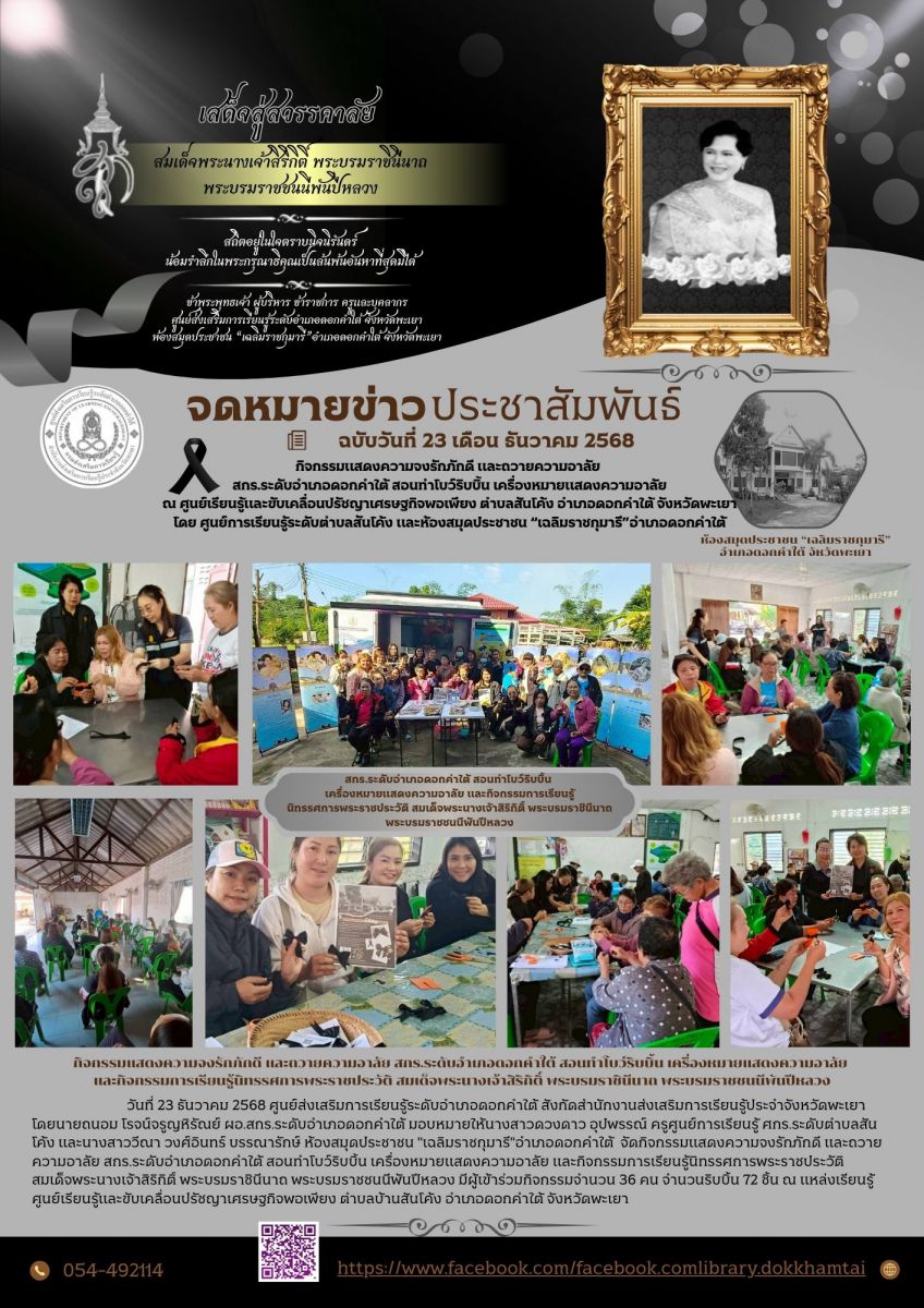 วันพฤหัสบดีที่ 25 ธันวาคม 2568 ห้องสมุดประชาชนจังหวัดพะเยา ดำเนินกิจกรรมส่งเสริมการเรียนรู้ “อาสา พาทำโบว์ริบบิ้น” เพื่อถวายความอาลัย สมเด็จพระนางเจ้า...