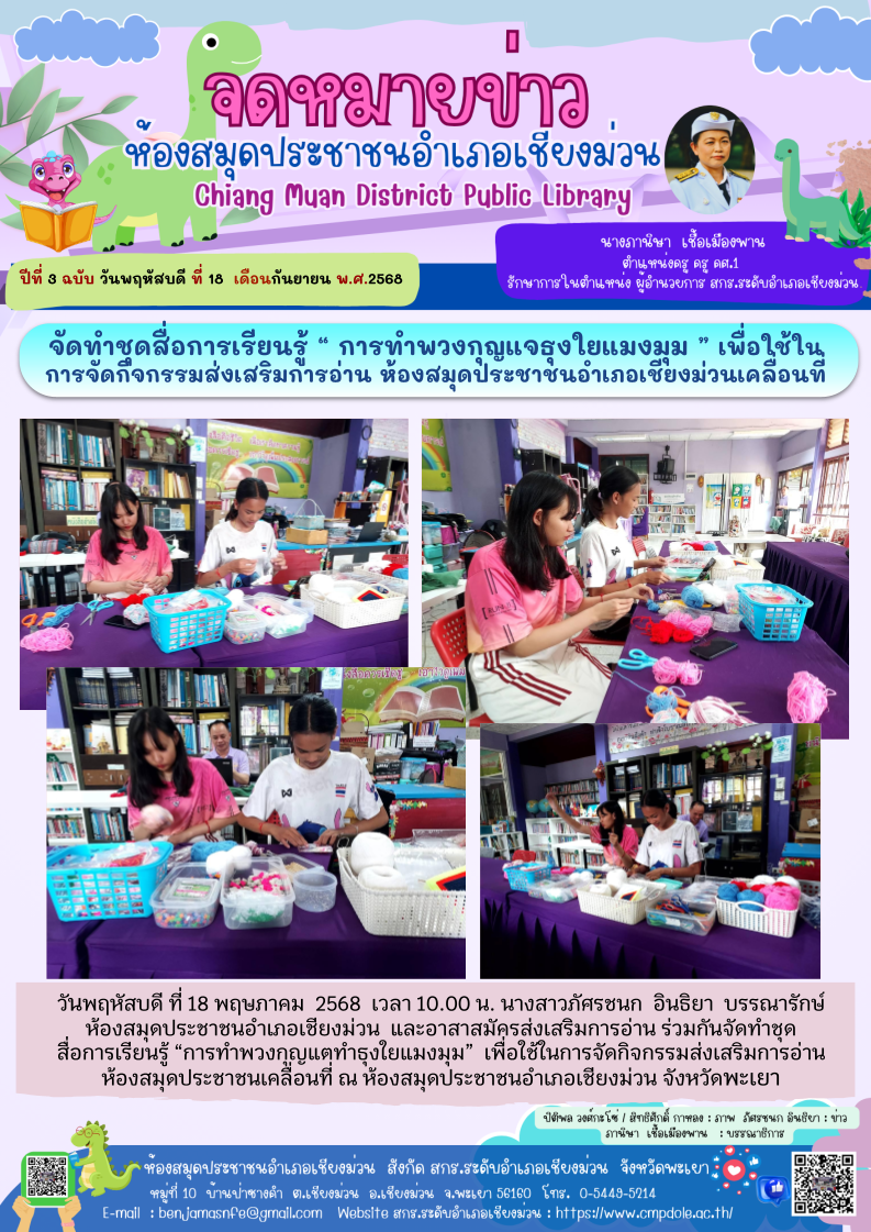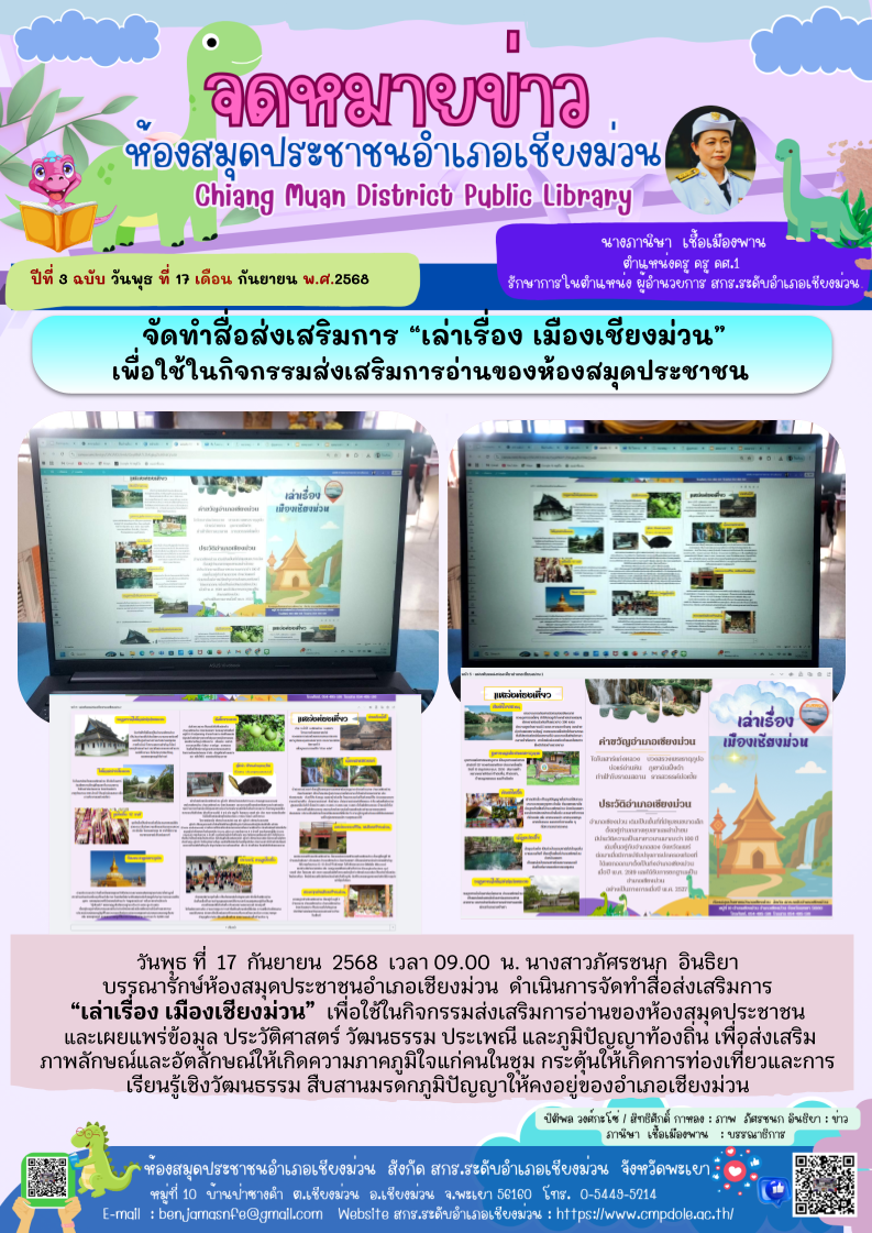 วันพฤหัสบดี ที่ 18 กันยายน 2568 เวลา 10.00 น. นางสาวภัศรชนก อินธิยา บรรณารักษ์ห้องสมุดประชาชนอำเภอเชียงม่วน และอาสาสมัครส่งเสริมการอ่าน ร่วมกันจัดทำ...