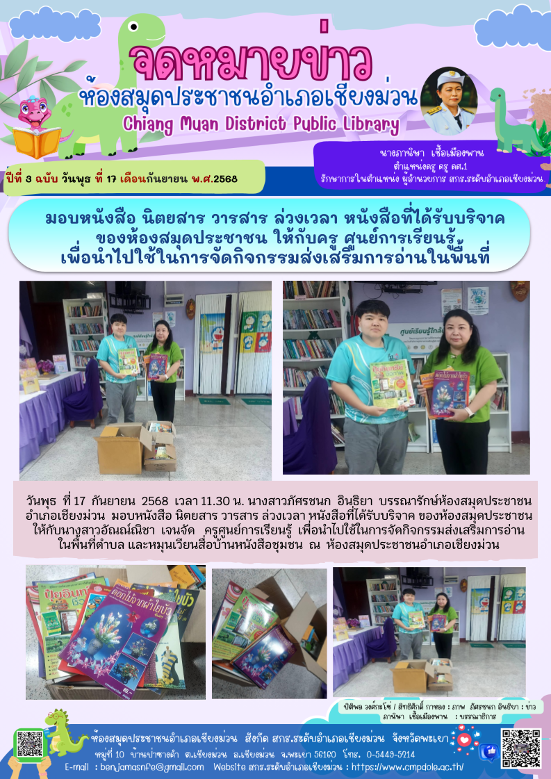 วันพุธ ที่ 17 กันยายน 2568 เวลา 11.30 น. นางสาวภัศรชนก อินธิยา บรรณารักษ์ห้องสมุดประชาชนอำเภอเชียงม่วน มอบหนังสือ นิตยสาร วารสาร ล่วงเวลา หนังสือท...