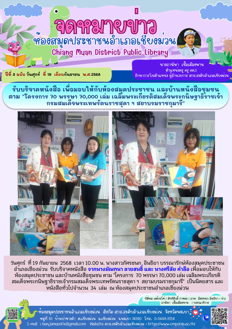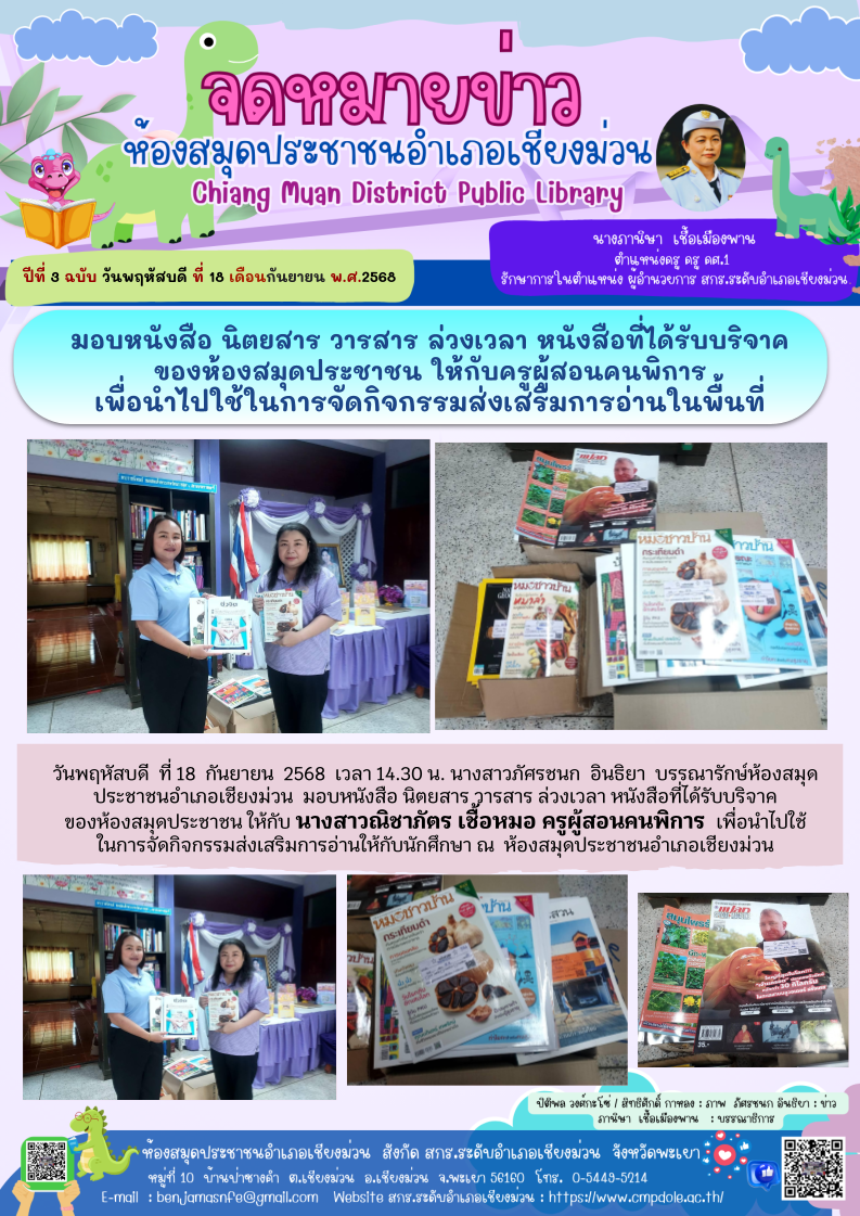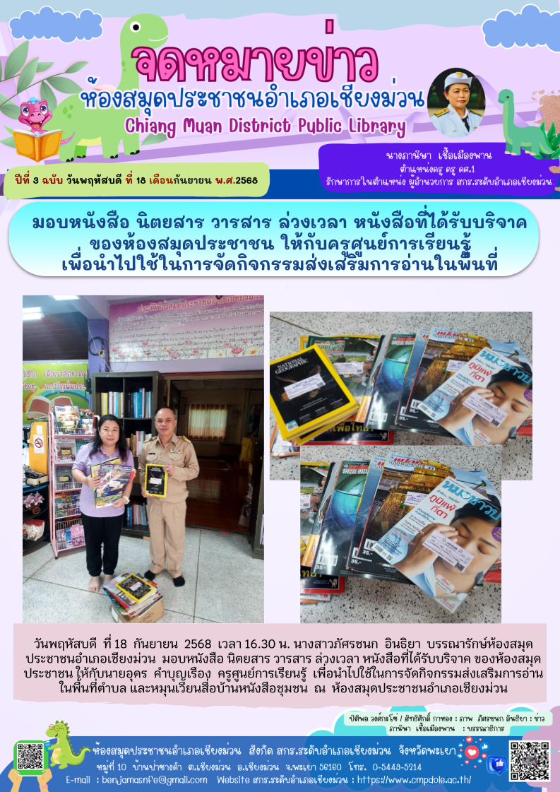 วันพฤหัสบดี ที่ 18 กันยายน 2568 เวลา 14.30 น. นางสาวภัศรชนก อินธิยา บรรณารักษ์ห้องสมุดประชาชนอำเภอเชียงม่วน มอบหนังสือ นิตยสาร วารสาร ล่วงเวลา หนังสื...