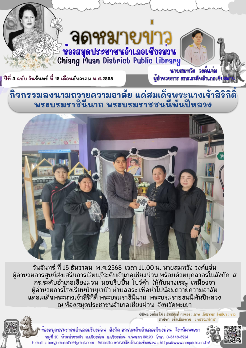 วันจันทร์ ที่ 15 ธันวาคม พ.ศ.2568 เวลา 09.30 น. นายสมหวัง วงค์แจ่ม ผู้อำนวยการศูนย์ส่งเสริมการเรียนรู้ระดับอำเภอเชียงม่วน พร้อมด้วยบุคลากรในสังกัด สก...