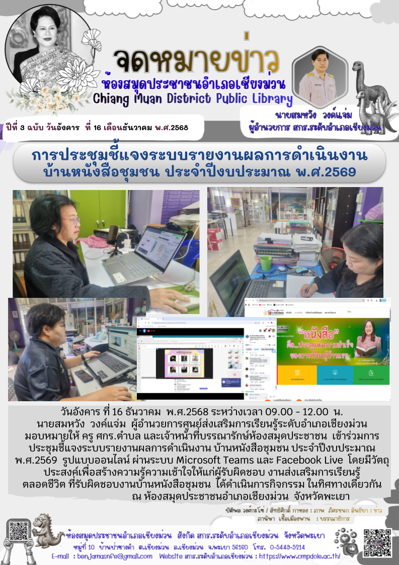 วันอังคาร ที่ 16 ธันวาคม พ.ศ.2568 ระหว่างเวลา 09.00 - 12.00 น. นายสมหวัง วงค์แจ่ม ผู้อำนวยการศูนย์ส่งเสริมการเรียนรู้ระดับอำเภอเชียงม่วน มอบหมายให้ คร...